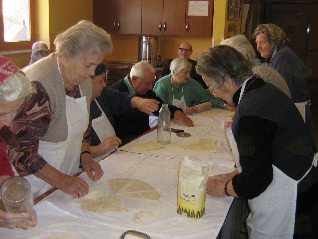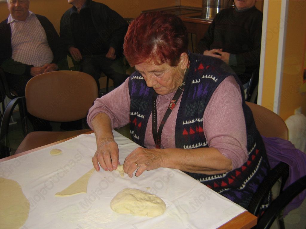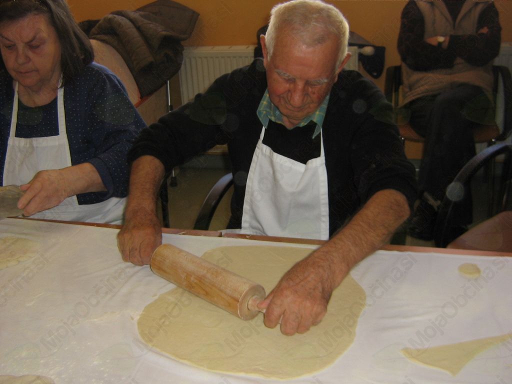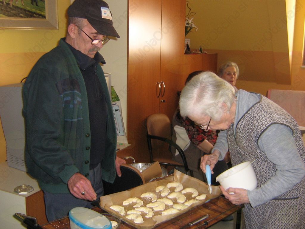 Na naši zadnji gospodinjski urici so stanovalci izrazili željo, da bi pekli kvašene rogljičke. Tiste slastne z marmeladnim, orehovim ali s čokoladnim nadevom. Ali pa tiste preproste brez nadeva, z le malo sezama ali maka. Kar stanovalci izrazijo, jim delovna terapevtka poskuša ustreči. V kuhinji se je dogovorila, da so kuharice zamesile testo. In v torek, 11. decembra, so zavihali rokave, si nadeli predpasnike in pridno valjali testo. Dela so se lotili tako stanovalke kot stanovalci. Sicer so bili slednji v manjšini. Izdelovali smo rogljičke iz dveh kilogramov moke. Najprej smo maso razdelili na 16 delov, nato pa pridno oblikovali kroge. Eni so potrebovali več pomoči, drugi manj. Večkrat je bilo slišati: "Dajte nam razvaljati testo, mi pa bomo zvijali rogljičke." Ker imamo v kuhinji le en valjar, smo si pomagali s steklenicami. Te so se prav fino obnesle. Ob pridnem rezanju in zvijanju smo naredili več kot sto rogljičkov. Bili so različnih velikosti - tako za tiste jedce z manjšimi usti kot za tiste z večjimi. Degustacija je sledila po popoldanskem nastopu čarodeja Andreja.
