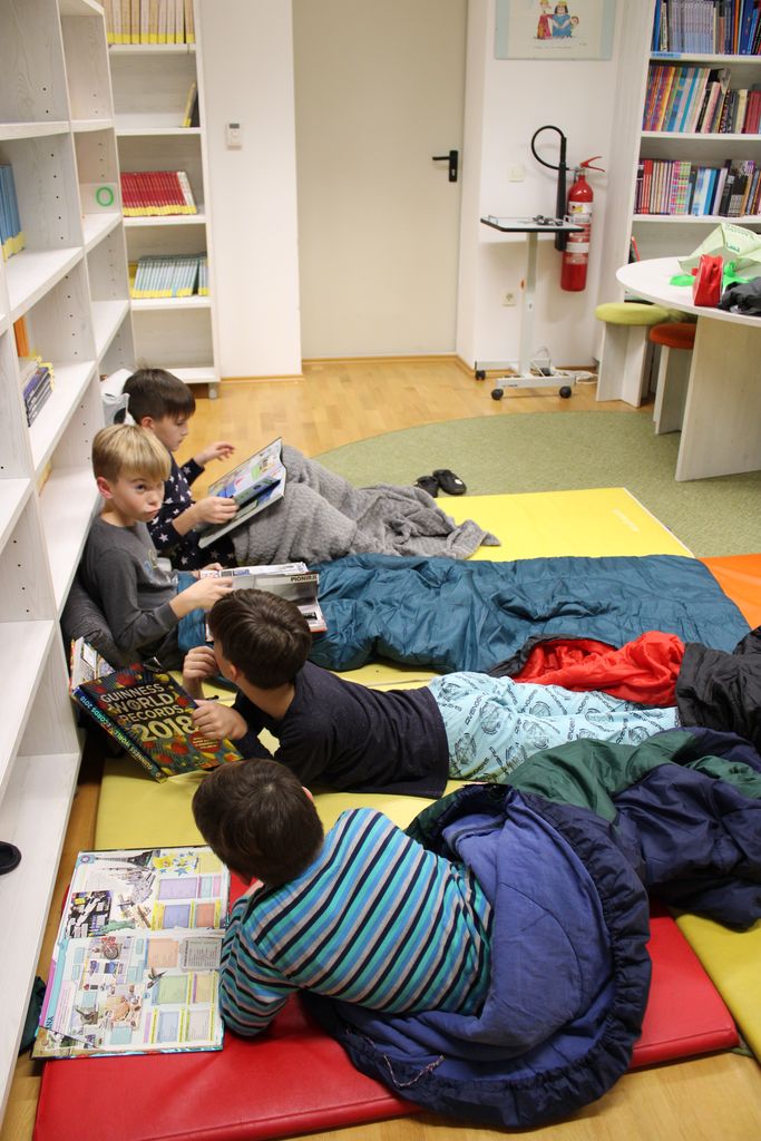 Po delavnicah smo iz plesne dvorane vzeli blazine, na katere smo dali spalne vreče in blazine. Preden smo se ulegli, smo si umili zobe. Potem smo na policah poiskali knjige, da smo jih pred branjem lahko brali. Šli smo spat. Zjutraj smo se zbudili. Hitro smo se obleki, si umili zobe in šli na zajtrk. V petek je normalno potekal pouk. Bilo mi je všeč.