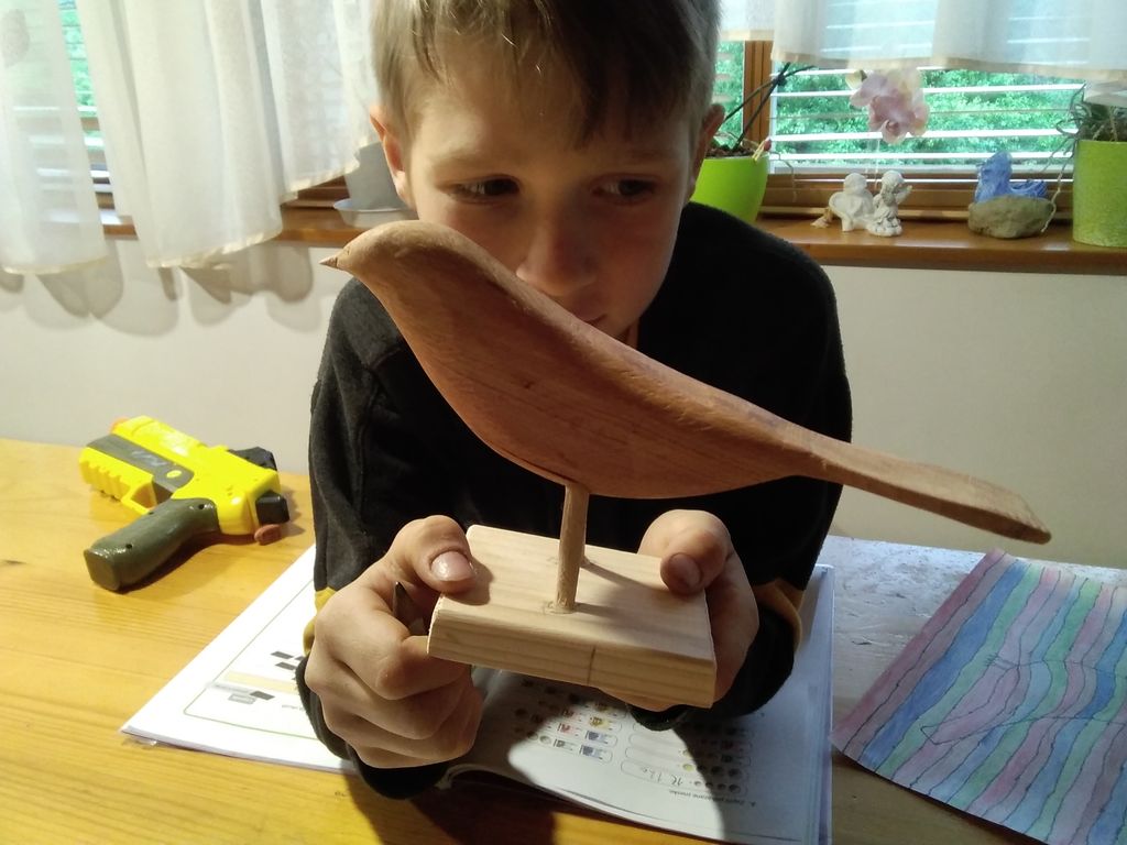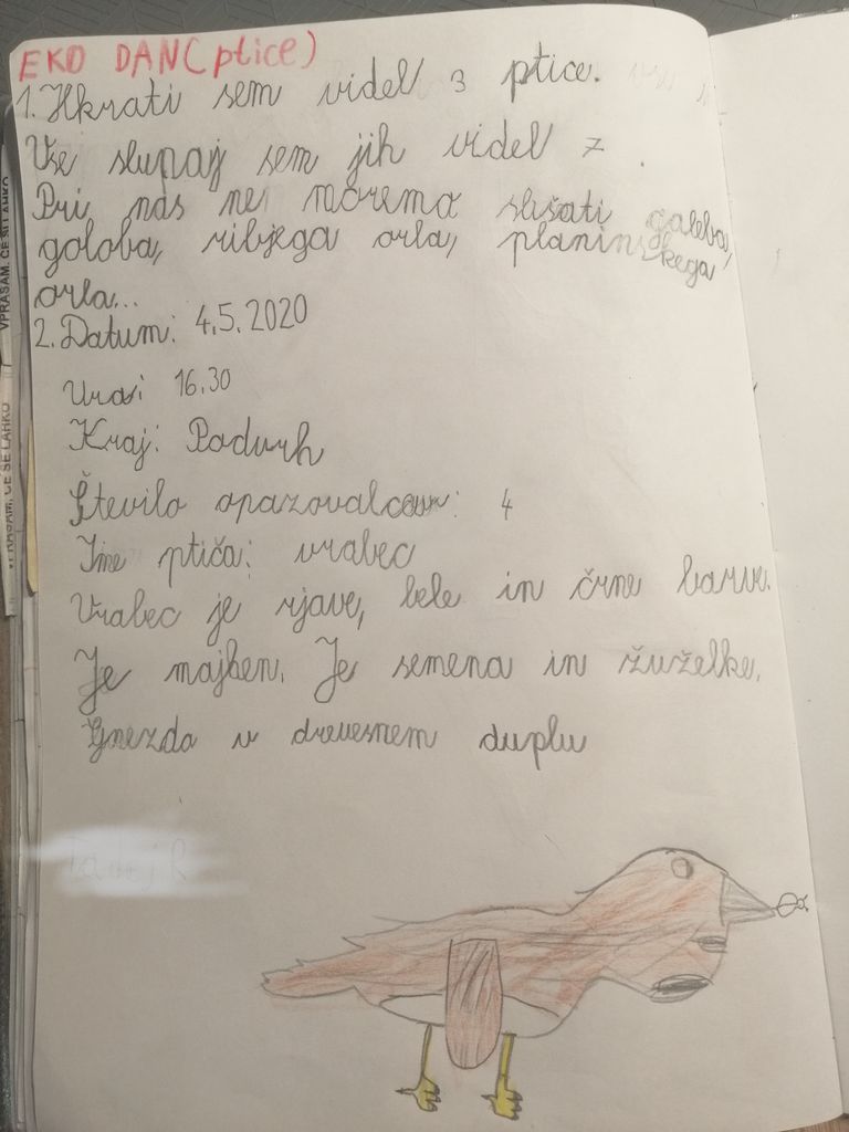Ker smo se zavedale, da vseh ptic res ne poznamo, smo pripravile nekaj gradiva in e-povezavo do brošure z naslovom Ptice Slovenije. Tako so si naši učenci v ponedeljek, 4. 5. 2020, naredili zanimiv družinski ekodan, ki so ga preživeli na prostem v družbi zanimivih slovenskih ptic. Najprej so morali opazovati ptice in prešteti le največje število ptic iste vrste, ki so jih videli hkrati, ter koliko ptic so opazili vse skupaj. Nato so si izbrali eno ptico, ki jim je bila všeč. Prepoznali so jo lahko tudi s pomočjo Priročnika za prepoznavanje ptic. Priročnik jim je omogočil, da so s pomočjo ilustracije in kratkega opisa lažje prepoznali ptico, ki so jo opazovali. Želele smo, da na kratko opišejo glavne značilnosti opazovane ptice, jo morda fotografirajo ali narišejo sami, izdelajo iz papirja, lesa, lego kock, gline, plastelina ali kakšnega drugega materiala, da lahko nastane tudi 3D-ptica.