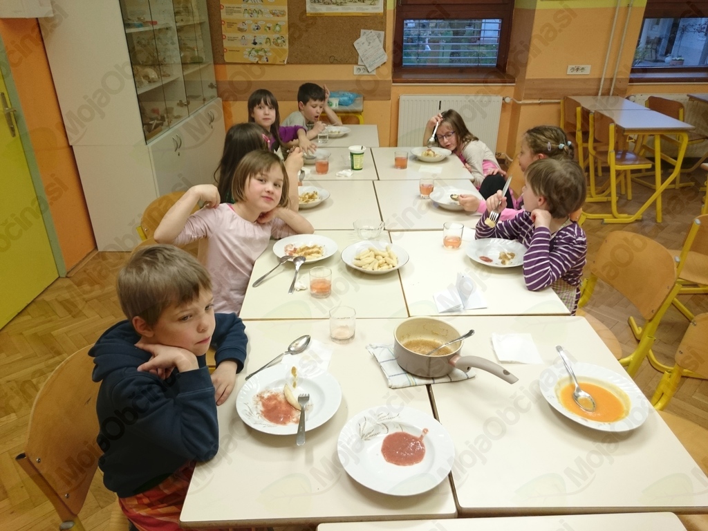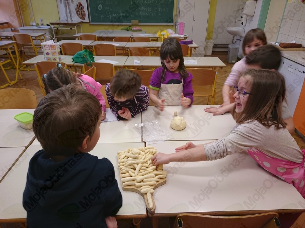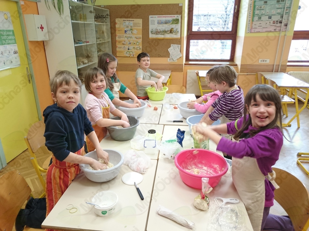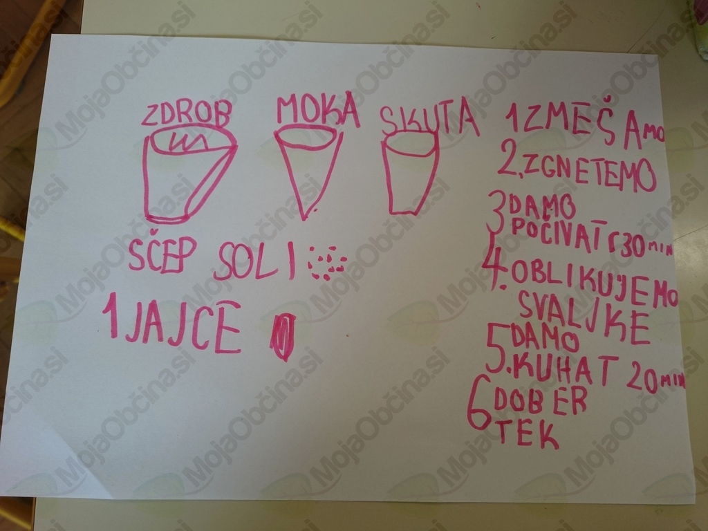 Najprej so učenci naredili gladko testo iz lončka moke, skute, zdroba in enega jajca. Nato so olupili in narezali korenček, kakšen krompir ter skuhali v slani vodi. Med tem so iz testa oblikovali svaljke in jih dali kuhati v osoljen krop. Ko je bila zelenjava skuhana, so jo zmiksali in juho seveda še vročo pojedli. Nekateri so ji dodali kislo smetano, drugi jušne kroglice, tretji oboje. Po juhi so sledili svaljki, katere so prelili z jagodnim prelivom ali drobtinami na maslu. Res je bilo okusno, saj ni nič ostalo. Preostalo testo za svaljke so otroci odnesli domov in skuhali večerjo za družinske člane. Natančen recept si lahko ogledate na fotografiji.
