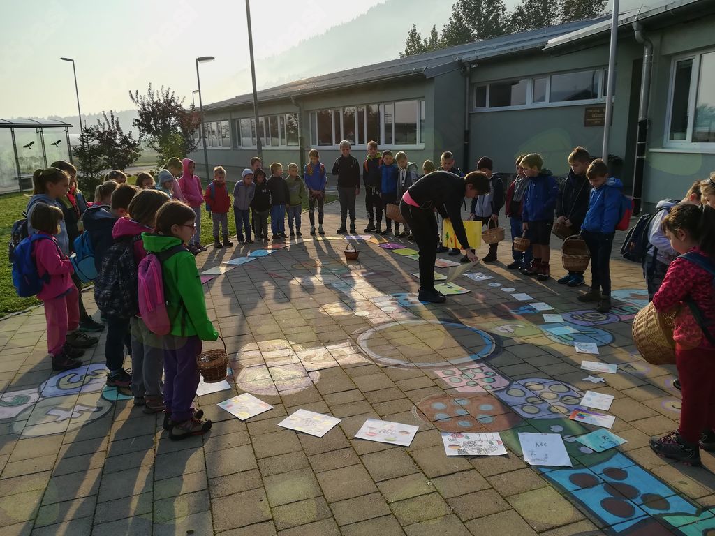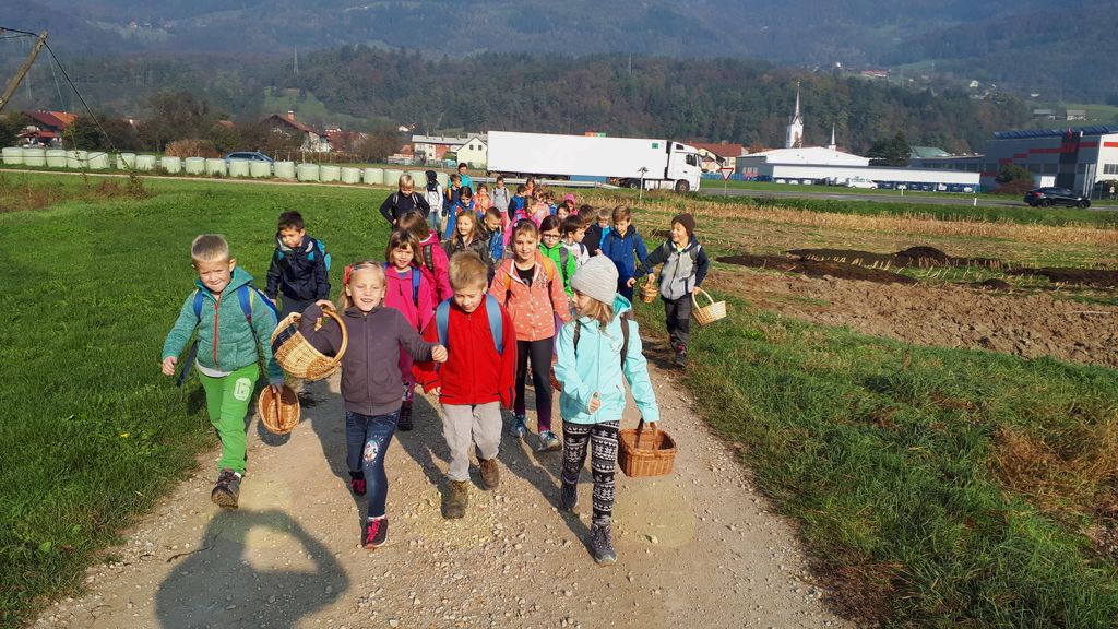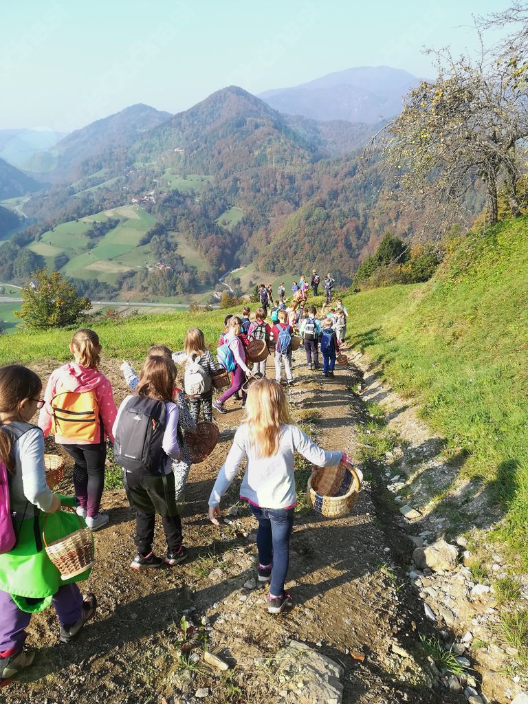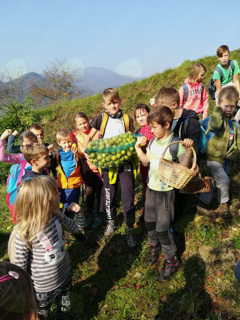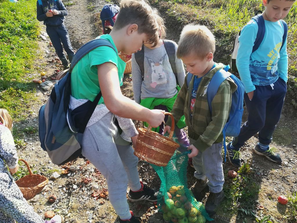 Letošnja jesen nam je resnično postregla z vsemi dobrotami v največjih možnih količinah. To smo izkusili tudi člani planinskega krožka Osnovne šole Vransko-Tabor. Na sončno soboto, 13. oktobra, smo se ob deveti uri zbrali pred šolo, kjer smo skupaj s člani lego krožka izbrali najprimernejše logotipe, ki smo jih ustvarjali za natečaj novega mednarodnega projekta Erasmus+ ABC, v katerem bo naša šola sodelovala v naslednjih dveh letih. Nato smo planinci začeli pot skozi trg Vransko, čez glavno cesto in nadvoz mimo Ilovice v gozd. Potem pa strmo v hrib v Zahomce do družine Kajbič, po domače »pr' Matij«. Želeli smo jim malo pomagati, zato smo nabrali košaro orehov ter s hruškami in jabolki napolnili kar pet žakljev. Po strmi poti navzgor se spodobi še strma pot navzdol. Kar čez gozd smo jo mahnili. Najbolj zabavno se je malo zakotaliti ali podrsati po suhem listju in tudi kakšnemu adrenalinskemu padcu smo se nasmejali. Ves čas smo s sabo nosili košarice, v njih pa kostanje in kakšno sočno domačo jabolko. Pohod smo zaključili na igrišču na Ločici, kjer so nas pričakali pečeni kostanji, pecivo gospe Jerman in bezgov sok kuharsko-vrtnarskega krožka. Najvztrajnejši so še celo uro igrali nogomet, drugi so se igrali v mivki ali na gugalnici, počivali in se sladkali. Lep dan smo preživeli v družbi številnih zvestih planincev in ob koncu tudi njihovih staršev, ki podpirajo našo planinsko dejavnost.