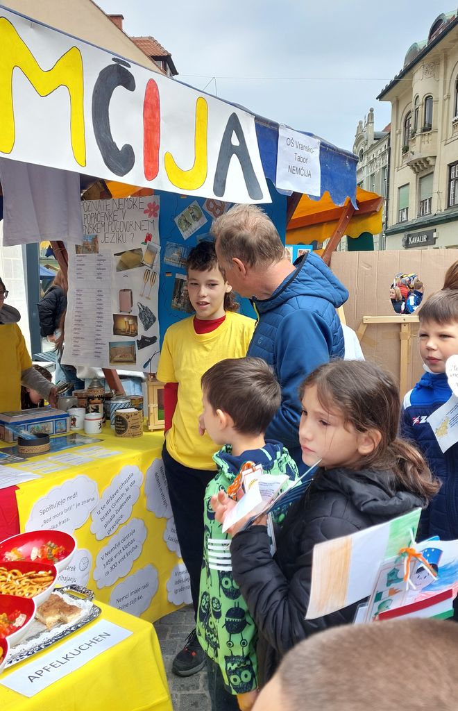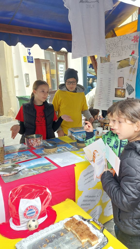 Naša stojnica je pritegnila številne obiskovalce, ki so z zanimanjem prisluhnili predstavitvam, okušali tipične nemške prigrizke, z učenci poklepetali v nemščini ter se preizkusili v kvizu in sestavljankah. Učenki Lana Lopan in Eva Topovšek pa sta na glavnem odru zapeli vedno aktualno skladbo »Ein bisschen Frieden« (Malo miru).