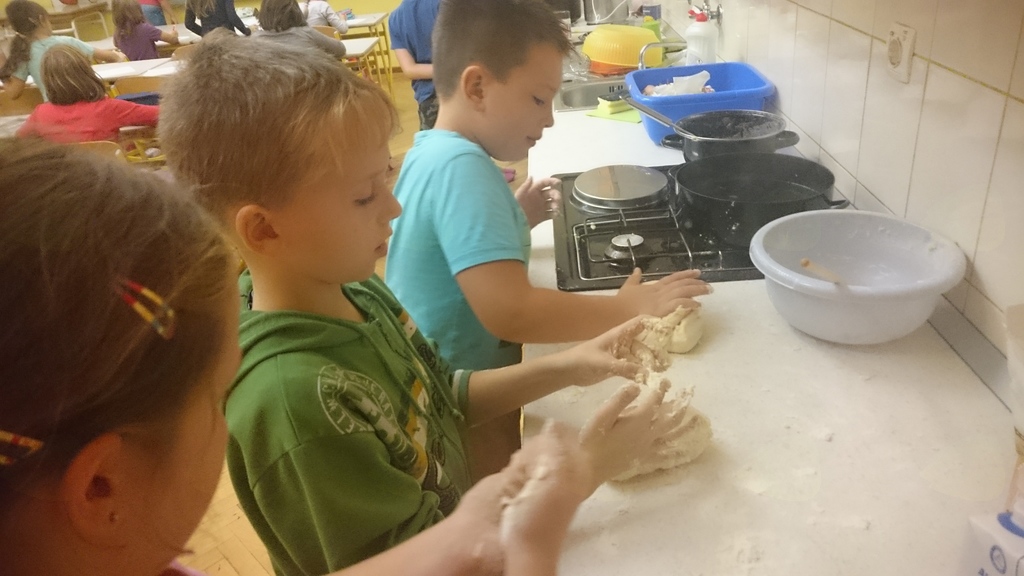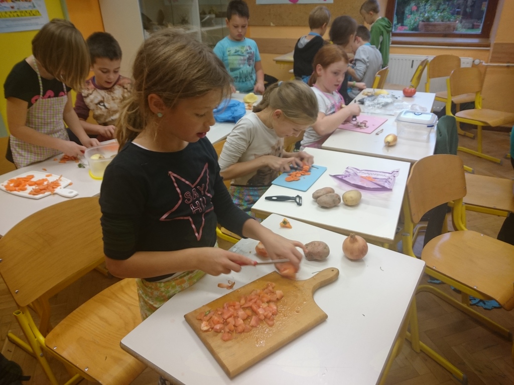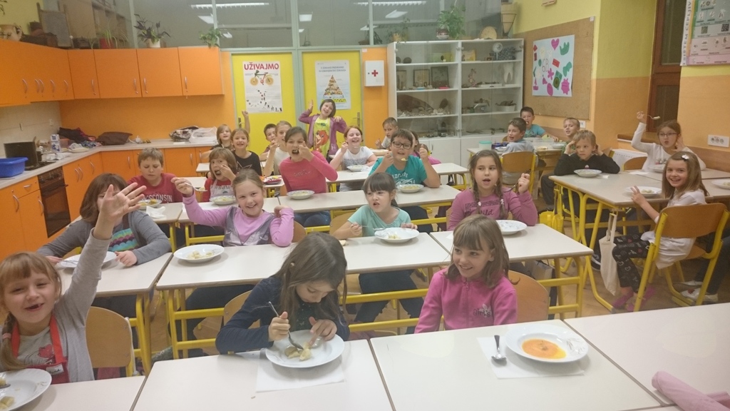 Na tokratnem srečanju smo se odločili skuhati paradižnikovo juho, ki je učencem manj poznana, zraven pa še korenčkovo juho za tiste, ki nad paradižnikom niso najbolj navdušeni. Učenci so samostojno olupili in narezali sestavine, napravili testo za kroglice in jih spekli, zgnetli krompirjevo testo za svaljke, jih naredili in skuhali ter seveda vse skupaj tudi pojedli. Vsak je za sabo pomil posodo in pospravil prostor. Recept za paradižnikovo juho so otroci zapisali s pomočjo učenke Nike, ostale pa so zapisale in razdelile učiteljice.