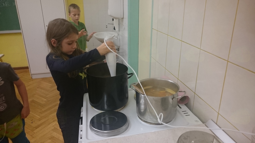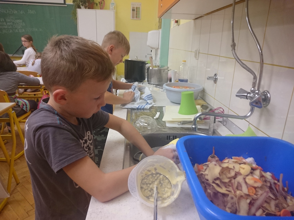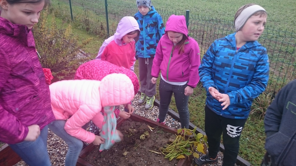 Poleg dela v kuhinji so nekateri učenci odšli na šolski vrt, kjer so pobrali prva fižolova semena in jih shranili za pomladno sajenje, začimbe z vrta pa smo pri kuhanju dodali juhi. Prvo srečanje je potekalo v prav prijetnem in sproščenem vzdušju in upamo, da se bodo učenci še naprej pridno udeleževali naših kuharsko-vrtnarskih doživetij.