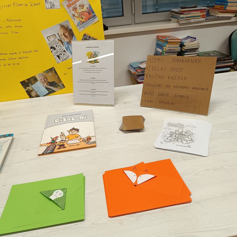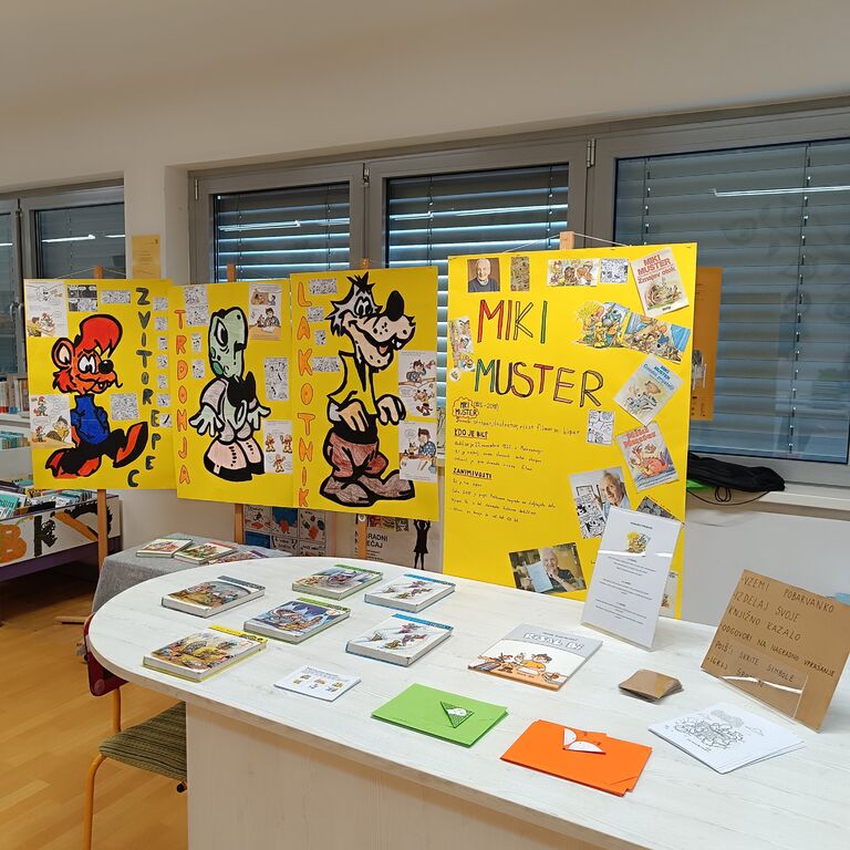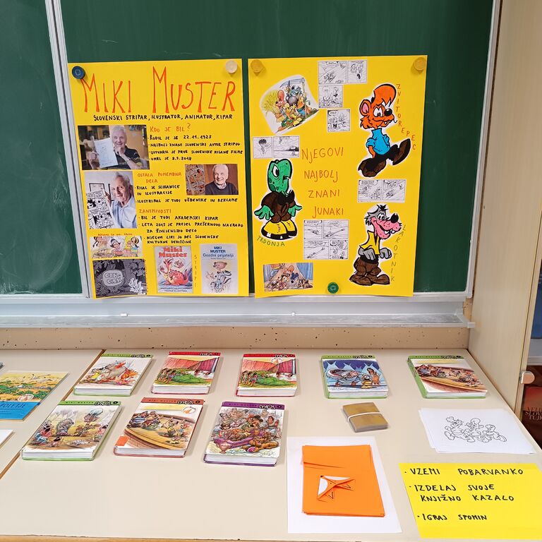 V šolski knjižnici smo z učenci knjižničarskega krožka pripravili razstavo o legendarnem slovenskem striparju, animatorju in ilustratorju Mikiju Mustru. Njegova dela so zaznamovala več generacij bralcev, učenci naše šole pa so imeli priložnost pobliže spoznati njegov ustvarjalni svet.