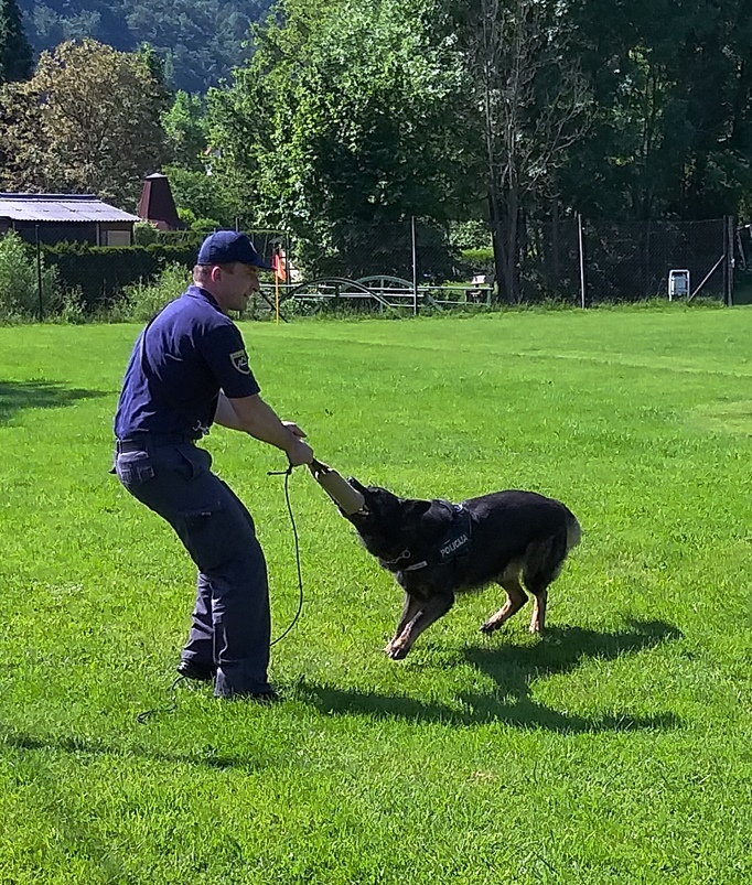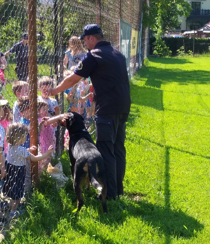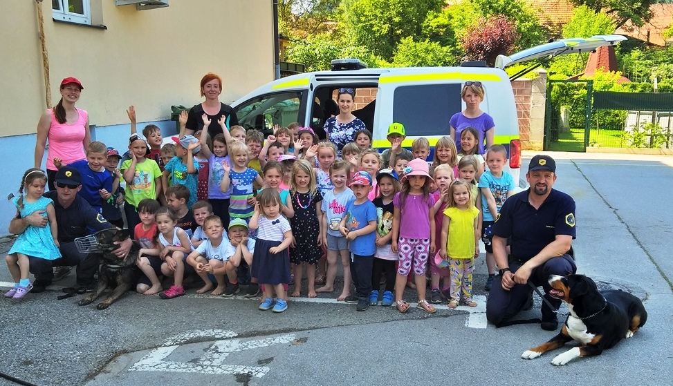 Poletje je prikorakalo v vsem svojem sijaju. Čudovito toplo torkovo dopoldne sta nam še dodatno popestrila policijska psa, sedemletni Art in petletni Maks, s svojima policistoma vodnikoma Nikolajem Zorcem in Boštjanom Ramšakom. Vodnika službenih psov sta nam prikazala sposobnosti in spretnosti svojih štirinožnih varovancev, ki sta nas zelo zabavala in navduševala s svojo ubogljivostjo in znanjem. Poleg njunih veščin smo si lahko ogledali tudi vozilo z boksi, zaščitna oblačila in opremo vodnikov službenih psov, najbolj pogumni pa so oblačila in zaščitna sredstva lahko tudi preizkusili. Vsi smo si bili edini – polepšali in obogatili so nam dan.