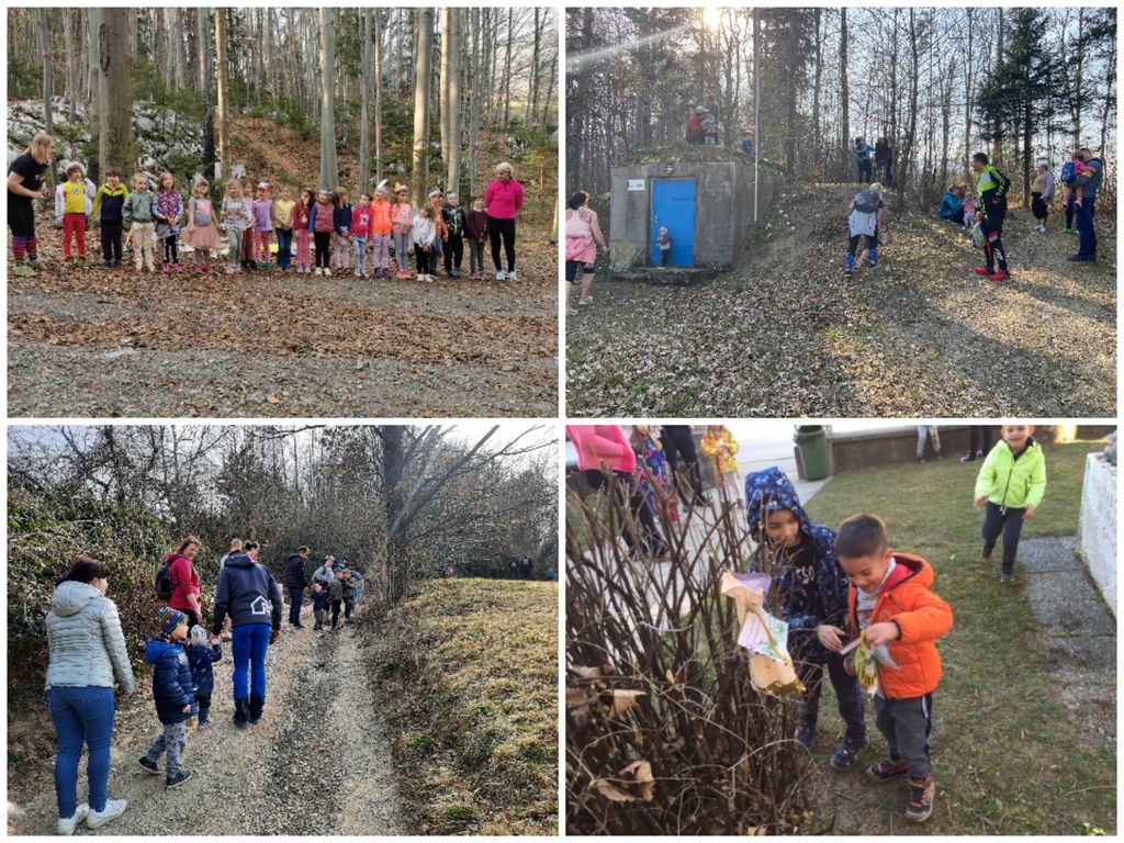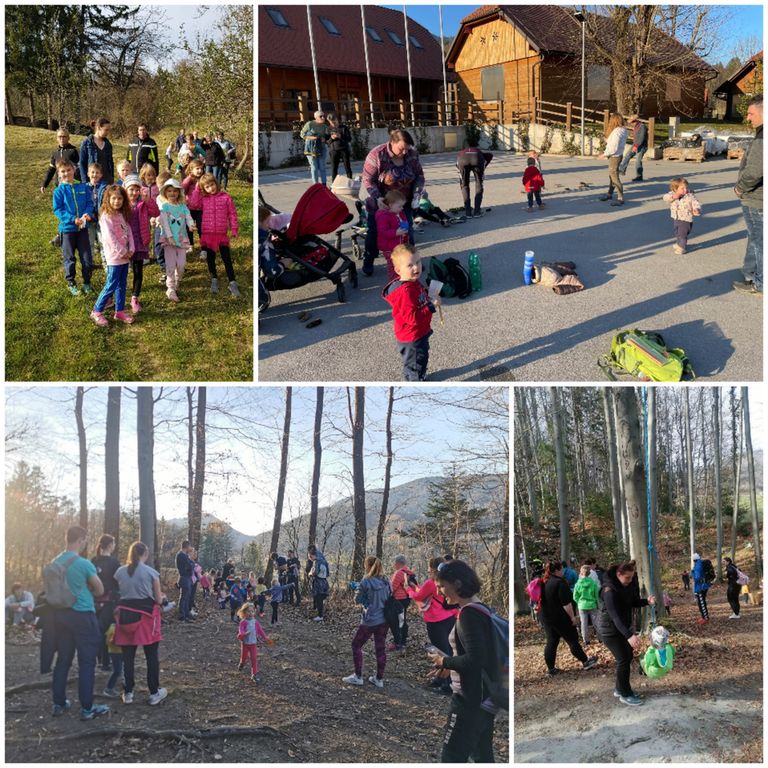 V zadnji dneh marca nam je bilo vreme naklonjeno in prav vse skupine smo se na srečanju, ki smo ga poimenovali »Čez griček v gozdiček«, odpravile na pohod. Vzgojiteljice so za otroke in starše pripravile različne izzive. Nekatere skupine so ob poti reševale naloge, iskale znanilce pomladi, spet druge so se srečale z orientacijo, iskanjem skritega zaklada … Na cilju pa so se otroci lahko igrali v gozdni igralnici, s padalom, reševali gibalne izzive v sklopu projekta Mali sonček, najstarejši otroci so se v gozdu predstavili z dramatizacijo po glasbeni pravljici Gradič, nekateri oddelki pa so za starše pripravili krajši kulturni program …