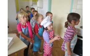 Tudi v vrtcu smo pričeli s kuharskim krožkom, kot pravi kuharji v televizijski oddaji » Gostilna išče šefa«. Odpravili smo se v gospodinjsko učilnico OŠ Vransko, si nadeli kuharske kape in predpasnike ter se najprej teoretično poučili o peki mafinov. Nato je sledilo praktično usposabljanje. Najprej smo si ogledali štedilnik s pečico, se poučili o delu s pečico, umili roke ter pričeli z delom. Na delovni pult smo pripravili vse sestavine za peko mafinov. Otroci so pričeli rezati čokolado na majhne koščke. Mmm, kako je sladko, vsi smo bili rjavi okrog ust – le zakaj? Najmlajša otroka v skupini sta dajala papirčke za mafine v pekač. Ostali smo tehtali in dajali sestavine v posodo ter zmešali z mešalnikom. Vsak mali kuhar je vzel žličko, zajel maso, jo dal v pekač ter vstavil v pečico.