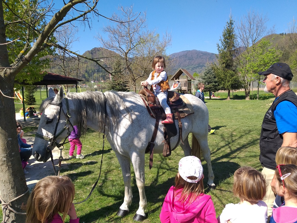 Na sončno in toplo petkovo dopoldne smo v Vrtcu Vransko dobili težko pričakovan obisk. Povabilu v vrtec se je namreč prijazno odzval dedek naših treh varovancev, gospod Janko Vranič iz Prekope s kobilo Bejbo. Otroci in vzgojiteljice se je kar niso mogli nagledati, saj nas je s svojo mirnostjo in lepoto vse očarala. Velika večina prisotnih otrok je Bejbo božala, ji prinašala travo in rožice, ob Jankovi pomoči pa so se lahko povzpeli v sedlo in naredili krog ali dva po igrišču. Bilo je nepopisno lepo, doživeto in sproščujoče. Zatorej hvala gospodu Vraniču in Bejbi za to nepozabno izkušnjo, ki je bila za marsikoga velik izziv.