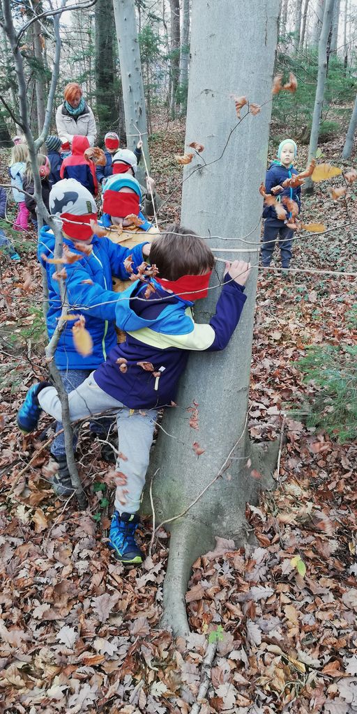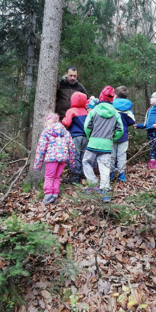 Tokrat nas je pot vodila skozi Gorico, ki je bila prelepo postlana z listjem. Nekaterim otrokom je segalo vse do kolen. Zaman smo iskali mala drevesa in »gozdno hobotnico«, ki jih je vso to listje pokrilo. Kljub temu pa nas je hoja in brskanje po listju, šumenje, metanje, kar nekaj časa zadržalo. Privoščili smo si pravo gozdno kopel in se ob igri nadihali svežega zraka. Nadaljevali smo pot proti Riglu, kjer sta nam gozdarja pokazala »gozdno kopalnico«. Kar nekaj nas je bilo razočaranih, saj ni bilo nikjer banje, brisač, kaj šele vode. Vse nam je bilo jasno, ko smo zvedeli, da se divji prašiči kopajo kar v blatu in se drgnejo ob drevesa, namesto v brisačo. Ker je na drevesu smola, smo tam opazili nekaj dlak divjih prašičev, ki so se prilepile na drevo. Nekateri smo si jih vzeli »za domov« in da jih pokažemo še drugim prijateljem iz vrtca.
