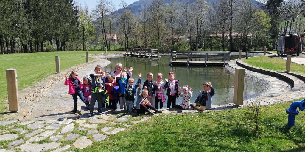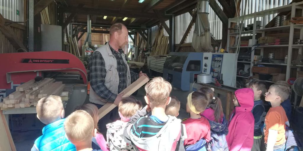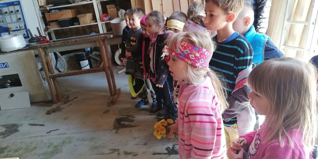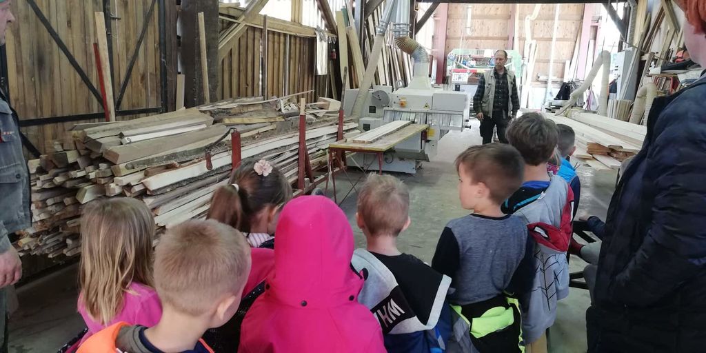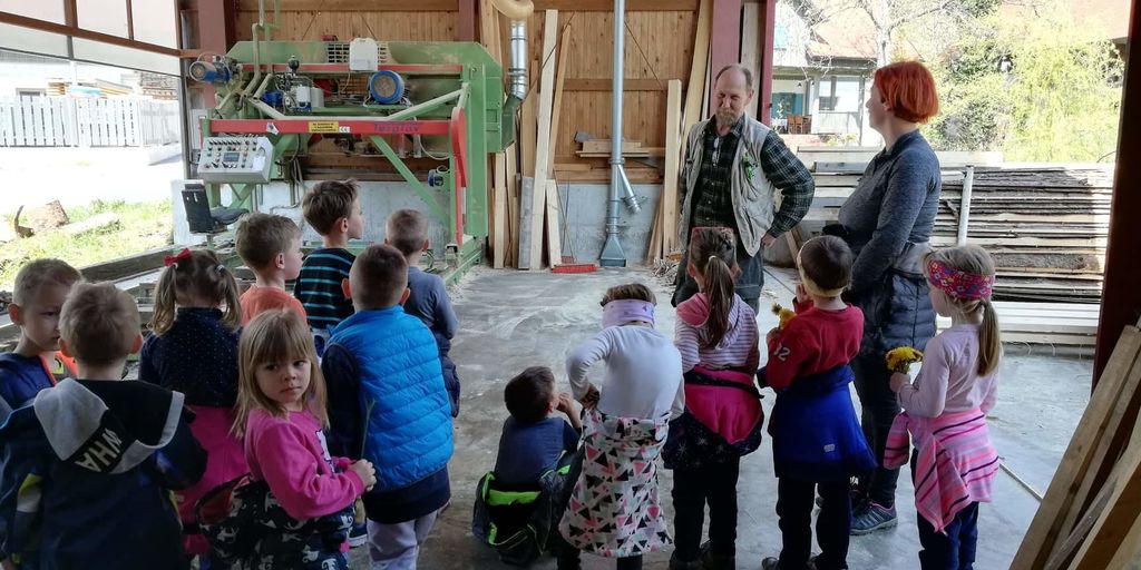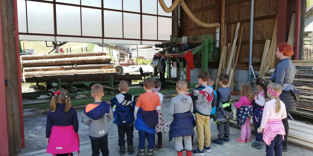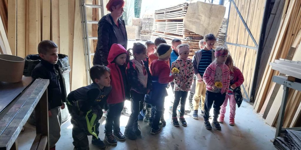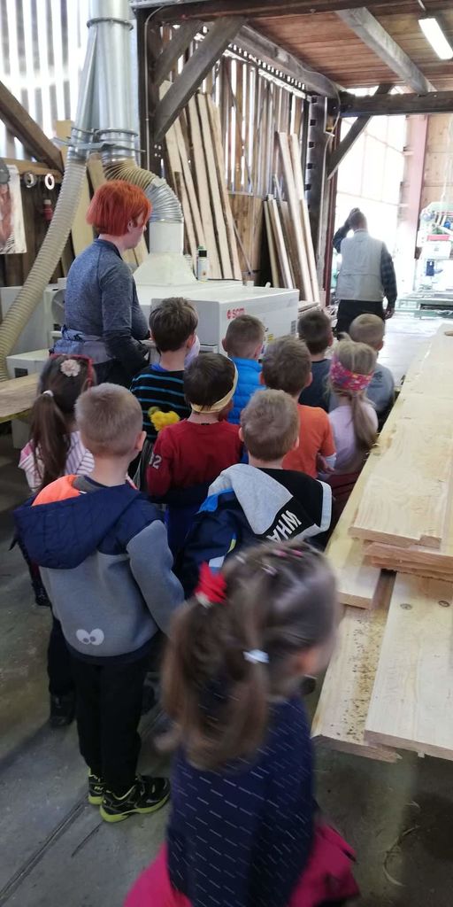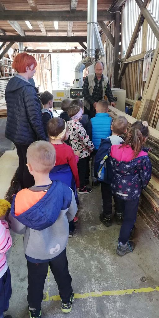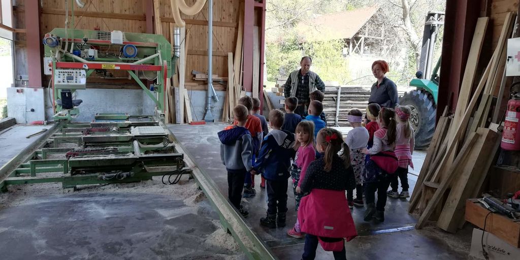 Na lep sončen dan smo se odpravili v Podgrad, kjer smo najprej videli, kako razžagajo velik hlod v deske, se naučili, kaj je krajec, ki ga odrežejo stran, da je deska lepša. Naslednja naprava je desko razrezala še na manjše deščice, ki jih potem g. Dejan da sušiti in porabi za različne lesene izdelke. Opazili smo veliko rumeno »gosenico«, ki se je migala sem in tja, zato smo g. Dejana vprašali, kaj je tam notri. Po celotni žagi smo sledili poti te gosenice in prišli do velikega silosa, kjer shranjujejo žagovino. Ta gosenica je žagovino posesala, da je ni neslo povsod naokrog. Če stara drevesa požagamo, je treba posaditi nova. To počne tudi g. Dejan. Iz Zavoda za gozdove dobi majcena drevesa, ki jih potem posadi v gozd. Pokazal nam je, kje čakajo, da bo imel čas in jih posadil. Videli smo majcene smreke in duglazije, ki so smreki zelo podobne. Izvedeli smo, da je najbolj »naša« jelka ali hoja, ki v slovenskih gozdovih raste že veliko veliko let. Na žagi pripravijo tudi les za sekance, s katerimi se grejemo v mrzlih zimskih dneh tudi v vrtcu. Za spomin na obisk na žagi nam je g. Dejan nažagal majhne hrastove kocke, ki smo jih odnesli domov in že med potjo proti vrtcu iskali ideje, za kaj jih lahko uporabimo. Na poti nazaj smo se ustavili še v kampu Podgrad, katerega lastnik je g. Dejan. Prijazno nam je dovolil, da smo si ogledali ribnik in hiške, ki nastajajo za turiste in tudi za nas. Dve uri je minilo, kot bi pihnil.