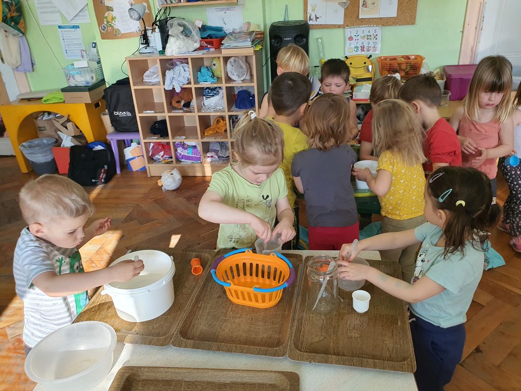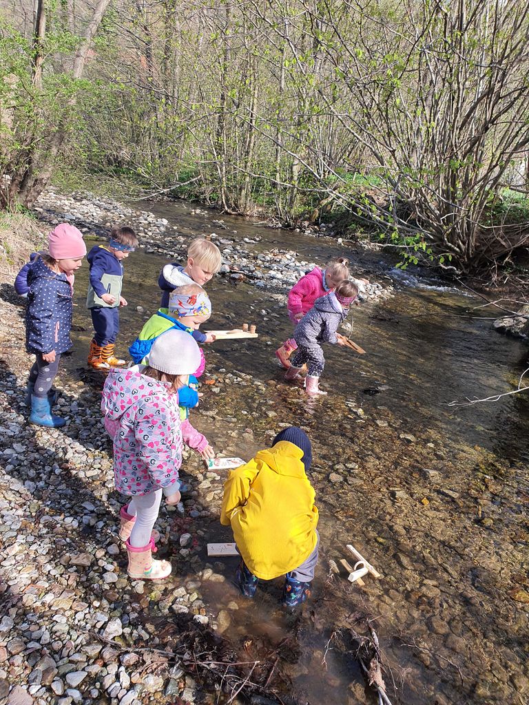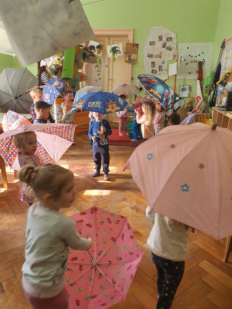 V igralnici in na prostem smo Izvajali najrazličnejše eksperimente in igre z vodo. Vodo smo prelivali in merili z nestandardnimi merskimi enotami. Vodne kapljice smo likovno upodabljali. Izdelali smo si različna plovila iz lesa ter v Podgrajščici ugotavljali njihovo plovnost. Hodili smo ob potočku, ga prečkali ter doživljali z vsemi čutili. Zgodba o Tinkinem dežniku nas je spodbudila tudi k plesnemu ustvarjanju in izražanju istih doživetij v drugem umetniškem jeziku.
