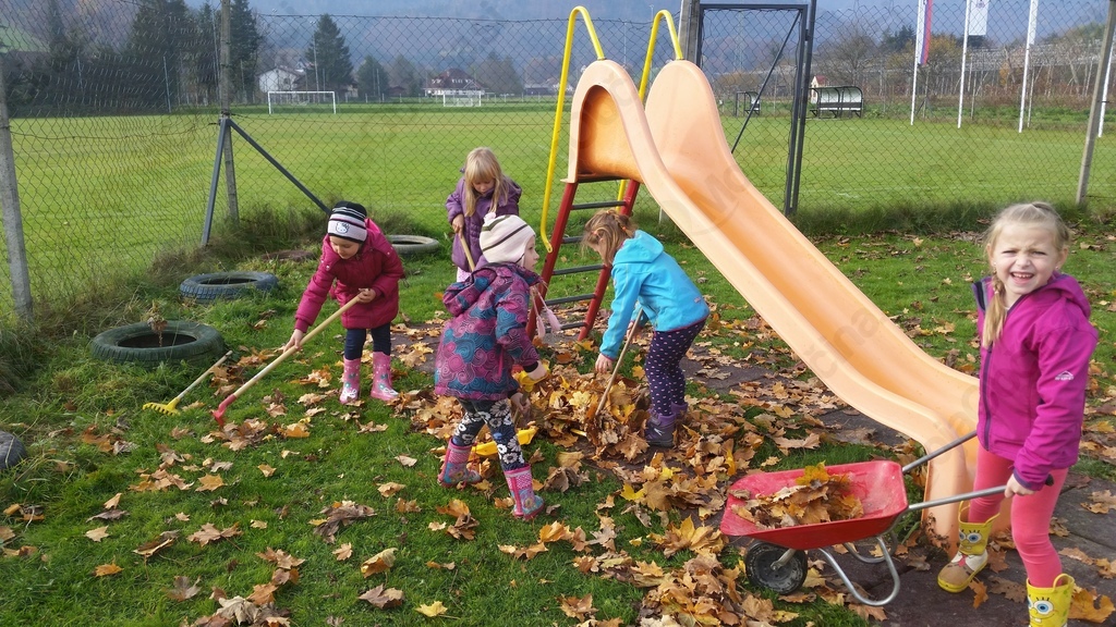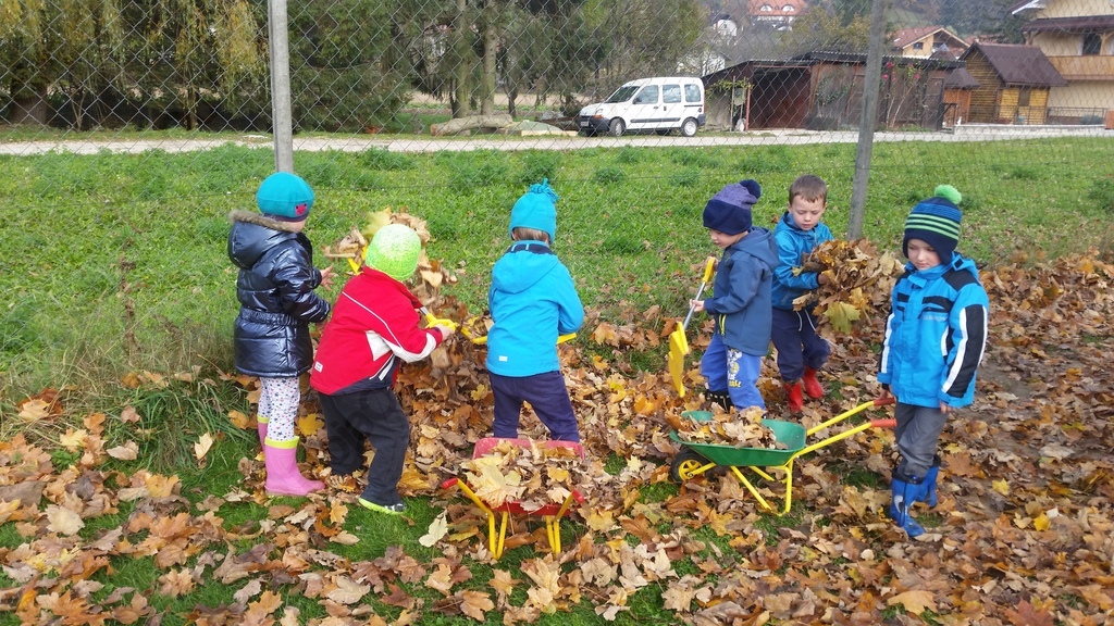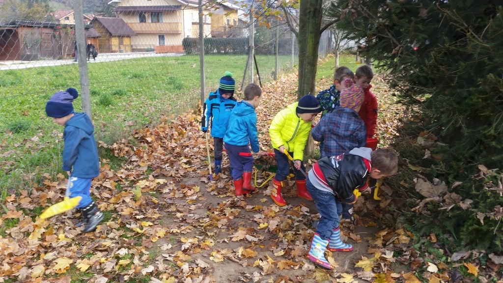 Grabili smo listje, nalagali na samokolnice, vozili na kompostnik, se igrali, skratka uživali. Otroci so iz listov naredili predstavo, gradili so hotel.