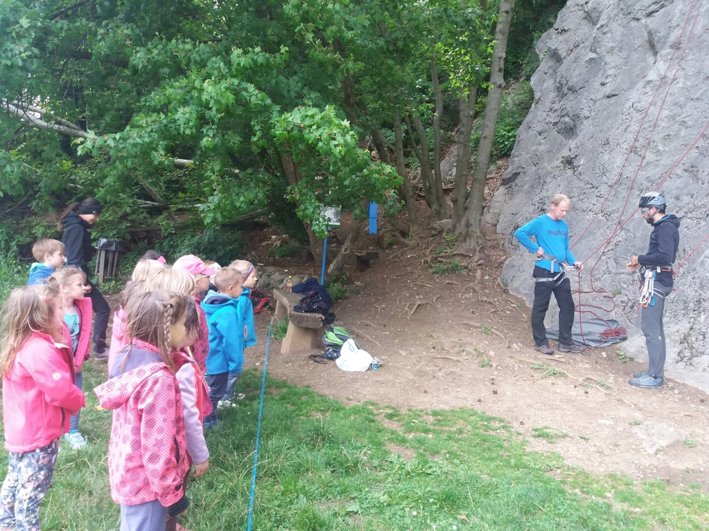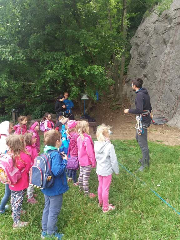 S plezalci iz Športno-plezalnega odseka Planinskega društva Vransko smo se dobili pri naravni plezalni steni na Vranskem. Plezalci so nam potrpežljivo razložili  pravila plezanja in spuščanja. Kmalu smo ugotovili, da je to še težje kot vzpenjanje.