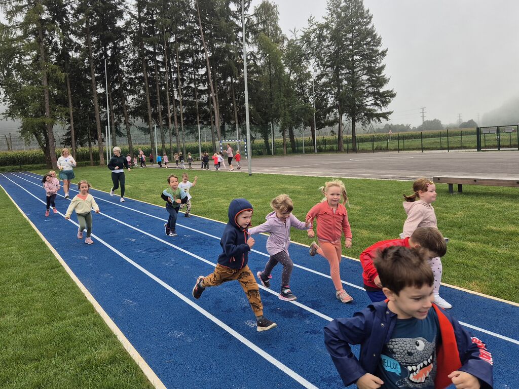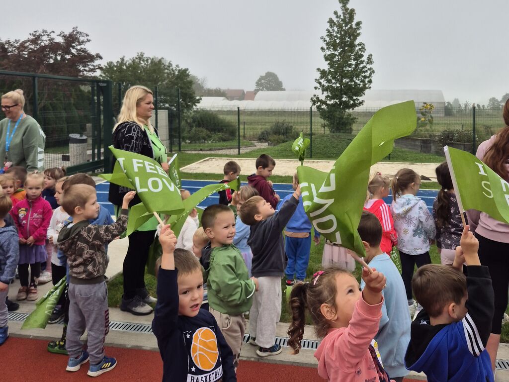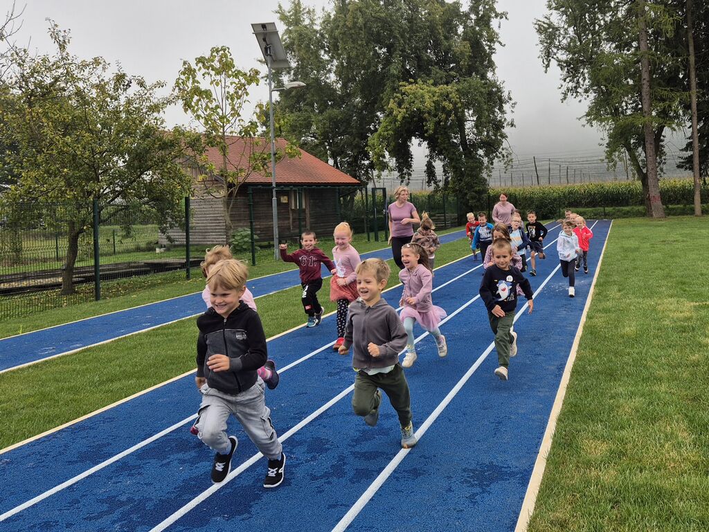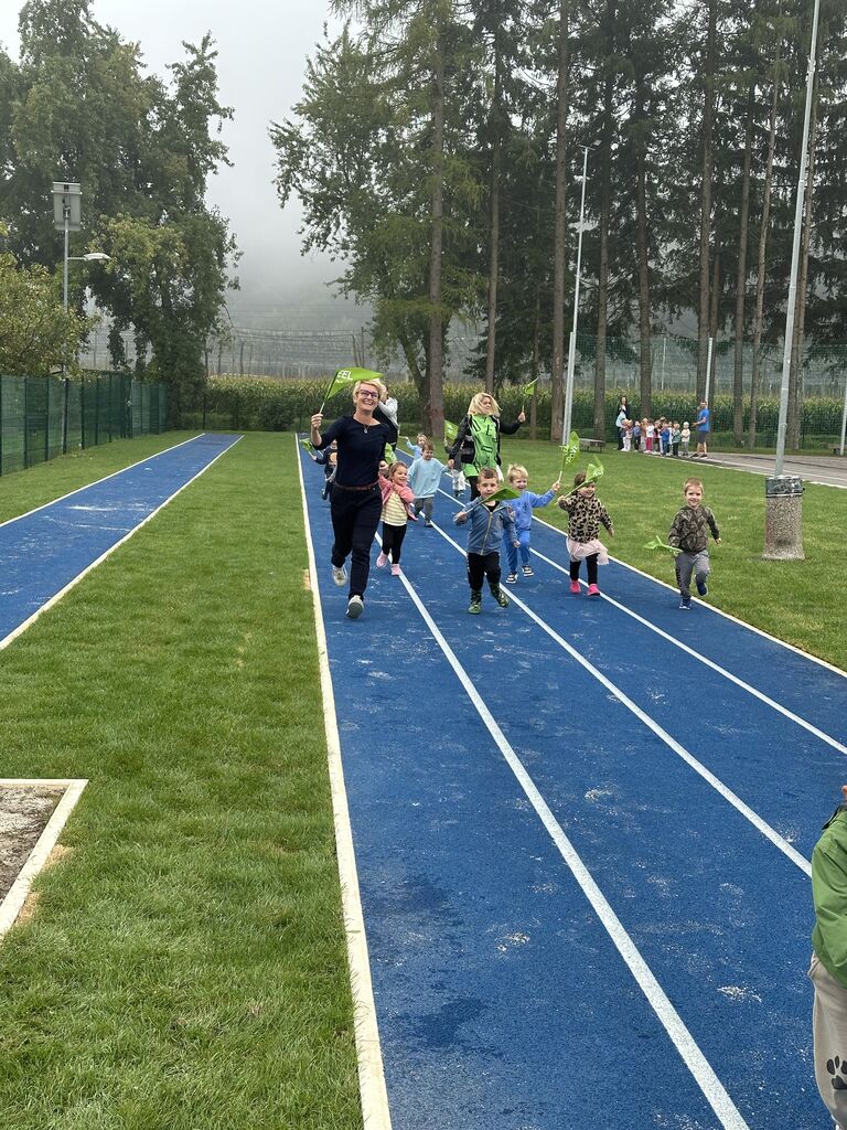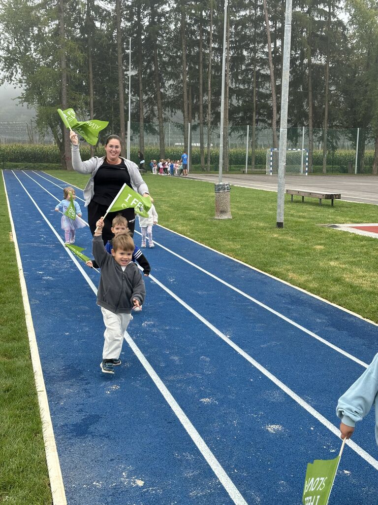 Kljub megli in rahlemu vetru smo v petek, 12. septembra, izvedli Množični tek otrok, ki ga vsako leto organizira Atletska zveza Slovenije pod sloganom »Začni mlad, tekmuj pošteno«. Teklo je 120 otrok iz vrtca v starosti od enega do šestih let in 18 strokovnih delavcev. Teku pa se je letos prvič pridružila nova ravnateljica šole, gospa Polonca Vodičar. S tekom smo otvorili novo stezo za tek na prenovljenem šolskem igrišču. Ugotovili smo, da je za nas prekratka, saj smo bili vsi zelo hitri, tudi naši najmlajši malčki. Tek smo si popestrili z zeleno podobo znamke I feel Slovenia, saj smo z veseljem spodbujali eden drugega z njihovimi zastavicami. Zahvaljujemo se jim za podporo in prispevek k lepši podobi dogodka. Na koncu smo prejeli zaslužene diplome, ki nam veliko pomenijo in krasijo oglasne deske pri igralnicah. Pri teku smo uporabili veliko ciljev iz novega Kurikula, in sicer skrb za zdravje in dobro počutje, socialne zmožnosti in spretnosti, čustveno doživljanje in izražanje, metaspoznavne možnosti … Pomembno se je gibati in uživati, zato se že veselimo prihodnjega Množičnega teka.