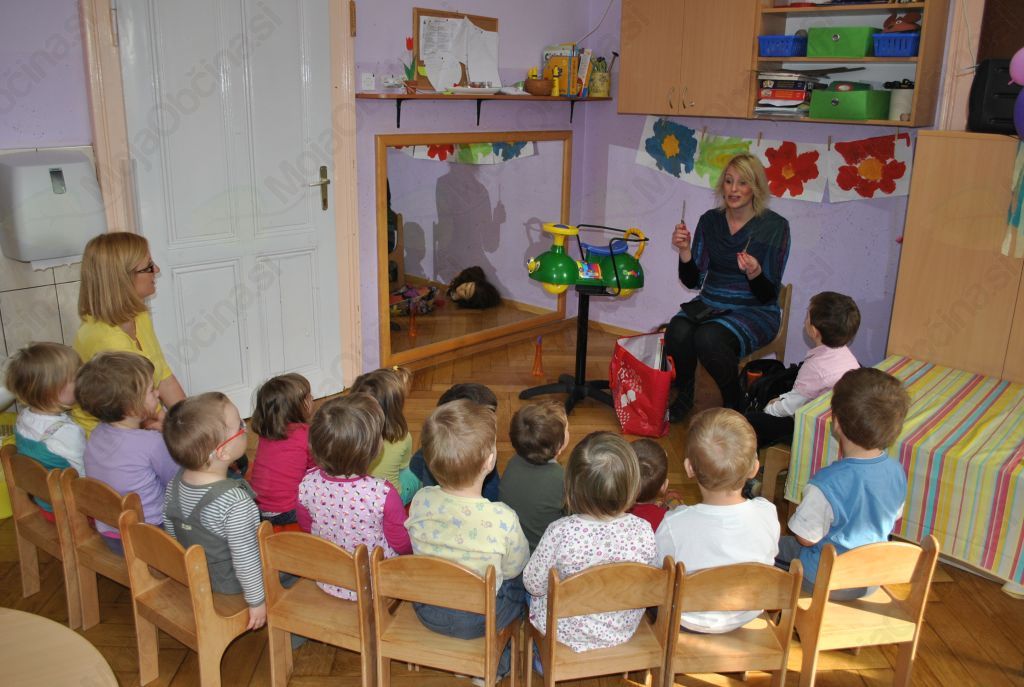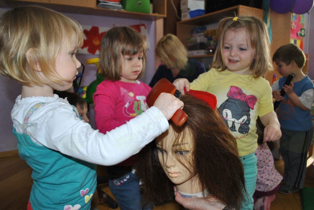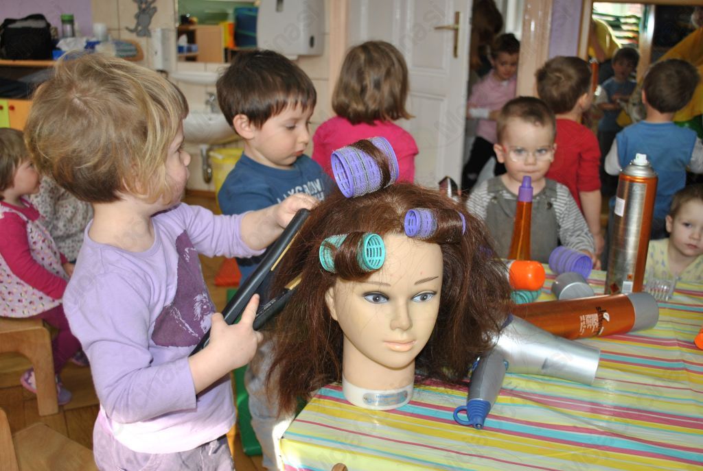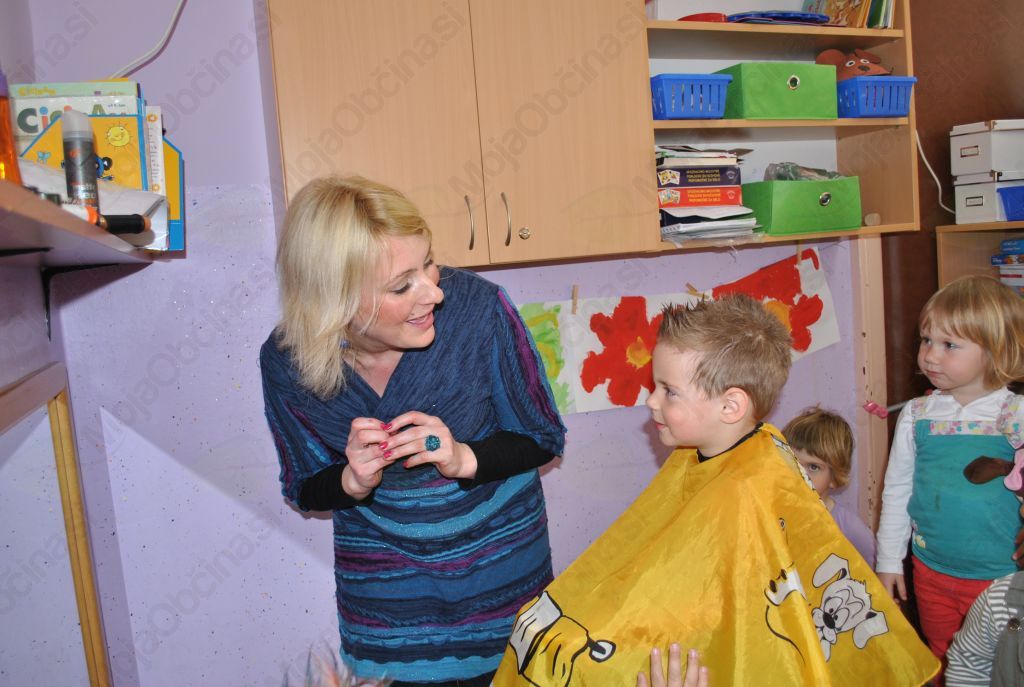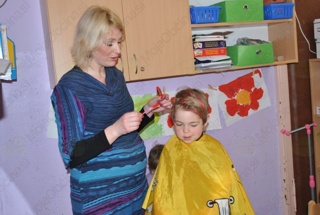 V aprilu smo v oddelku 2-3 spoznavali različne poklice. V ta namen smo povabili ga. Natašo Orehovec, da nam je predstavila poklic frizerke. Čeprav so vsi dobro vedeli, kaj frizer počne, so jih pritegnili vsi pripomočki, ki jih je ga. Orehovec prinesla s sabo v vrtec. Najbolj sta otroke pritegnili dve lutki, ki so ju po milji volji urejali, navijali, česali in frizirali, ter vzorci različnih las. Ga. Orehovec je vse otroke tudi sfrizirala na moderen način. Fantje so se lahko staršem pohvalili z barvnimi prameni in frizurami v obliki ježka ter dinozavra, deklice pa so se pohvalile z lepo spletenimi kitkami. Skupaj smo preživeli živahno in prijetno dopoldne.