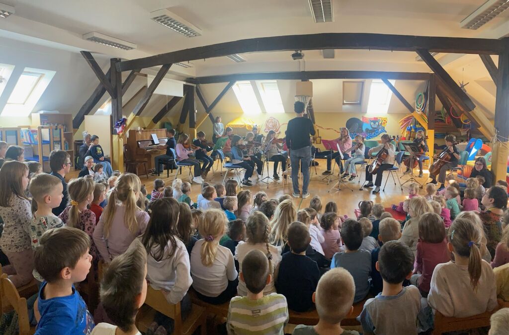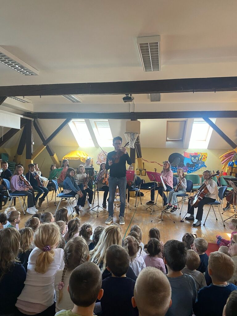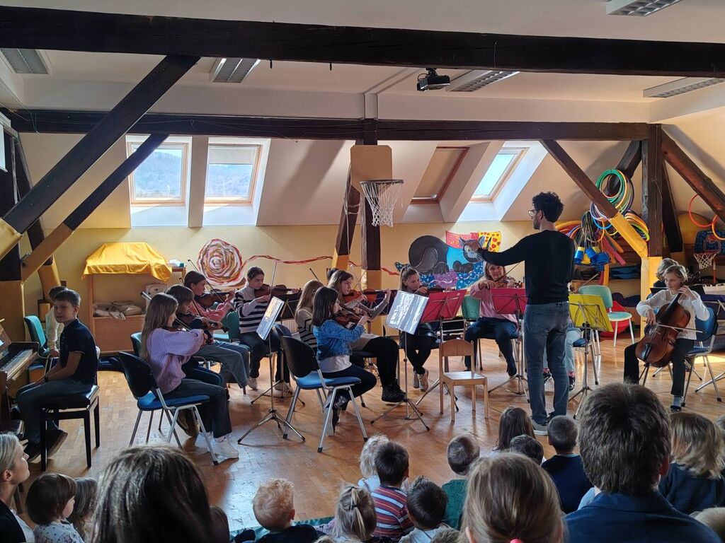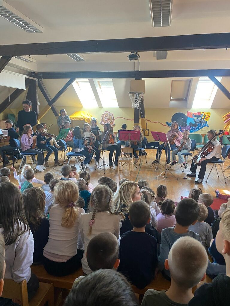 V mesecu marcu so nas obiskali učenci iz glasbene šole Risto Savin Žalec. Koncert so nam pripravili učenci godalnega orkestra pod vodstvom dirigenta Andraža Slakan. Predstavil je orkester, povedal, na katere instrumente igrajo učenci. Koncert je spremljal učenec na klavirju. Predstavil se je tudi solist na harmoniki.  Na zanimiv način je dirigent  opisal instrument violino. Zaigrali so otroške skladbe. Spodbujali smo jih z aplavzom.