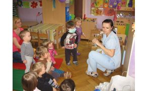 V aprilu nas je v oddelku 2-3 let obiskala ga. Martina Pavlič, mamica enega naših varovancev. Na zelo zanimiv in prijeten način nam je predstavila poklic in delo medicinske sestre. S sabo je prinesla cel kup pripomočkov, ki jih uporablja pri svojem delu. Otroci so jo ves čas poslušali in sodelovali pri preizkušanju pripomočkov. Nekateri so prav ponosno pokazali, da se zdravnikov in medicinskih sester prav nič ne bojijo.