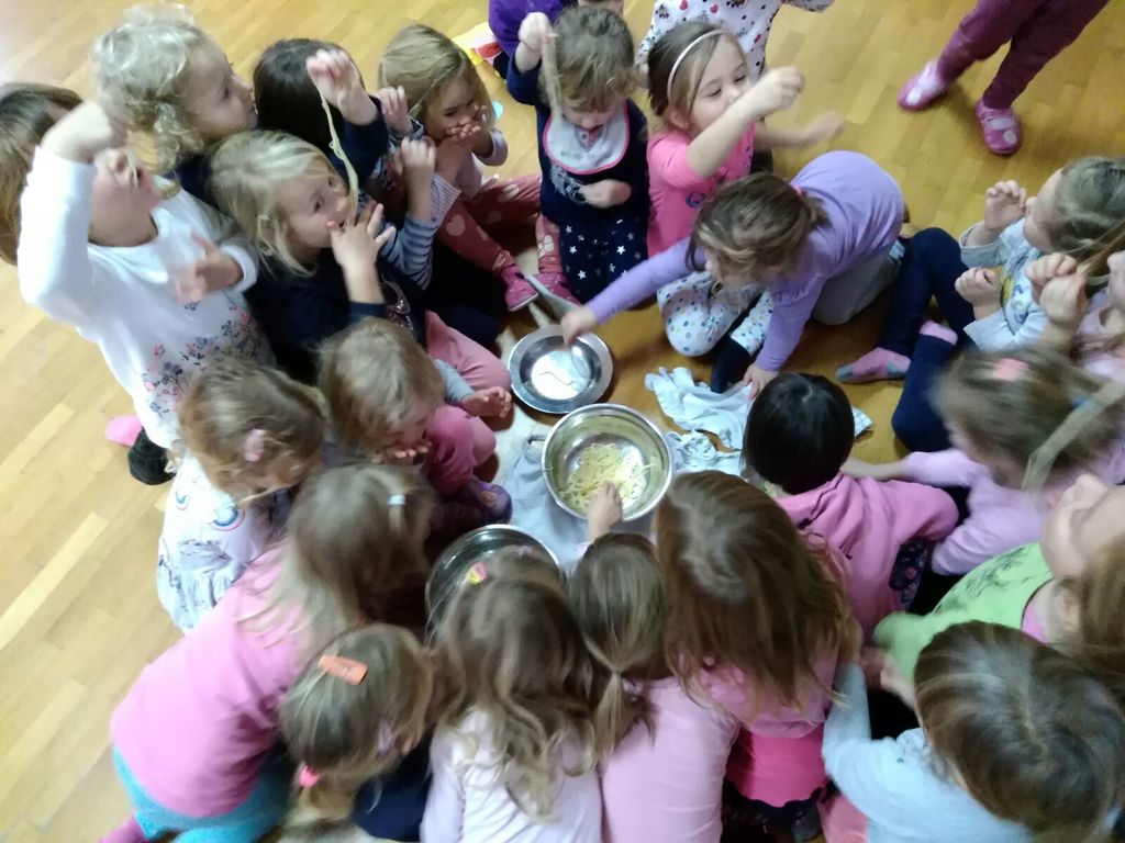 Tudi v letošnjem letu se vsak torek v večnamenskem prostoru vrtca zbiramo »plesni škratki«. Letos smo razdeljeni kar na dve skupini, na skupino 3-5 let ter skupino 5-6 let, ker je plesa željnih otrok zares veliko.