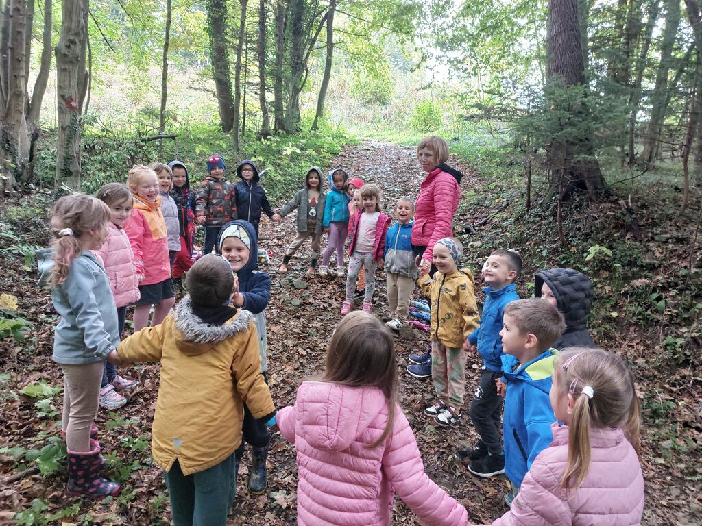 V tednu otroka smo se odpravili na cicipohod do bližnjega gozda, kjer so otroci opazovali jesenske spremembe v naravi in raziskovali gozdno okolje. Na poti smo bili deležni nekaj kapljic dežja, a to nas ni ustavilo – z nasmehi in dobro voljo smo nadaljevali ter se v gozdu razgibali ob socialnih in rajalnih igrah. Skupno doživetje nas je še bolj povezalo in spodbudilo prijaznost v dejanjih in besedah. Otroci so ob tem krepili sodelovanje, vztrajnost in občutek povezanosti z naravo – skladno s cilji novega Kurikuluma za vrtce, ki spodbuja izkustveno učenje, gibalni razvoj in trajnostno naravnanost.