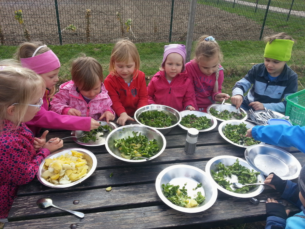 Kot že veste, mi radi vrtnarimo, tako smo v naši obstoječi gredi na igrišču za vrtcem uredili prostor za nove pridelke. Pripravili smo si zelenjavno malico. Pobrali smo motovilec, ga oprali, skuhali krompir in fižol ter se okrepčali. Njam, njam …