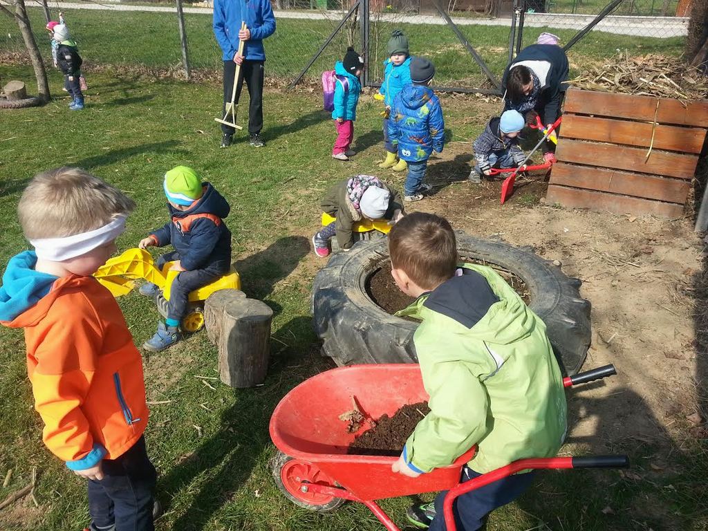 Zdaj pa je bilo v gredo potrebno dodati novo zemljo. Tudi to smo pridelali sami. Kompostnik smo bogatili skozi leto s pokošeno travo, z drevesnimi listi in vejami, prav tako smo mu dodajali hlevski gnoj, ki smo ga dobili z bližnje kmetije. Kompostnik smo odprli in zemljo dodali na gredo. Nekaj dni pozneje smo v gredo posadili krompir, ki smo ga dobili v dar od Kmetijske zadruge Vransko. Uredili smo še eno manjšo gredico in posadili solato, rukolo ter nekaj zelišč. Tudi tam, kjer rastejo jagode in maline, smo zemljo obogatili s kompostom za lažjo rast rastlin. Za delo so poprijeli vsi otroci z voljo do vrtnarjenja in željo po pečenem krompirju, zeleni solati, slastnih rdečih jagodah, malinah …