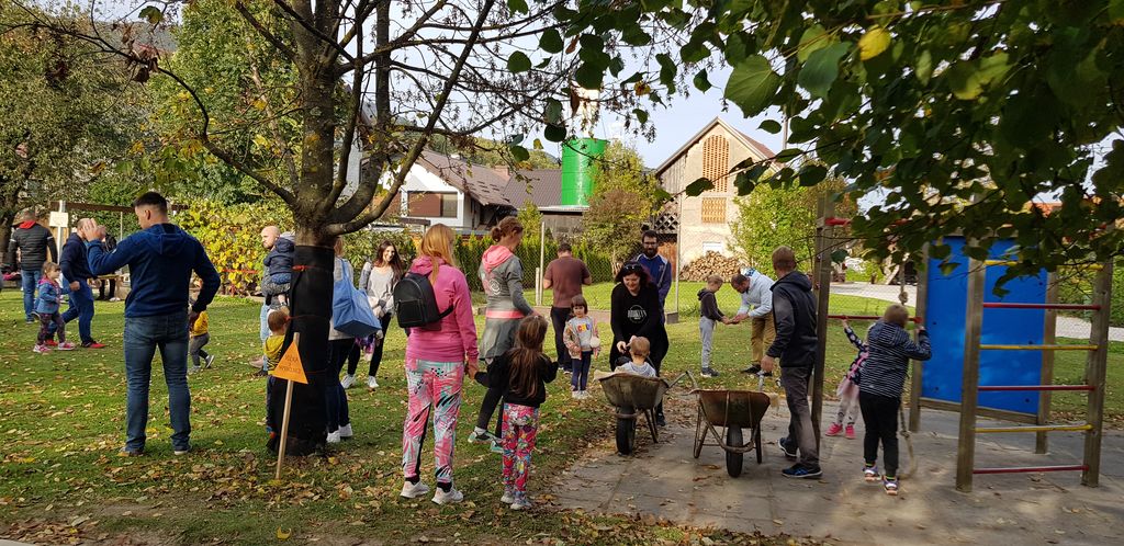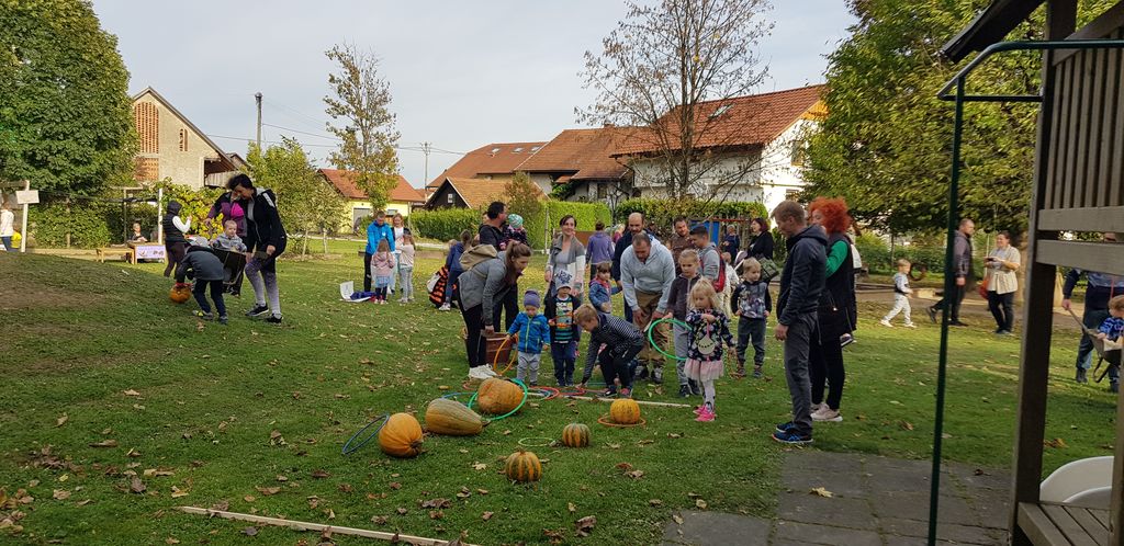 Naše prednostno področje je letos MATEMATIKA. Z matematiko se srečujemo v vsakdanjem življenju na vsakem koraku, zato tudi na srečanju ni šlo brez nje. Otroci so se skupaj s starši razgibali ob številnih gibalnih nalogah in poligonih, obenem pa so tako igraje utrjevali še oblike, barve in velikosti. Preizkusili so se v skokih v žakljih, vožnji s samokolnico, kotaljenju buč in nošnji otrok štuporamo. Za trud so bili nagrajeni z nalepkami v obliki barvnih likov. Na koncu so s skupnimi močmi izdelali še škrniclje za pečen kostanj in se z njim pogreli še v roke. Tu se posebej zahvaljujemo g. Mihu Pristaliču in g.  Miranu Pesku za pomoč pri pripravi in izvedbi peke.