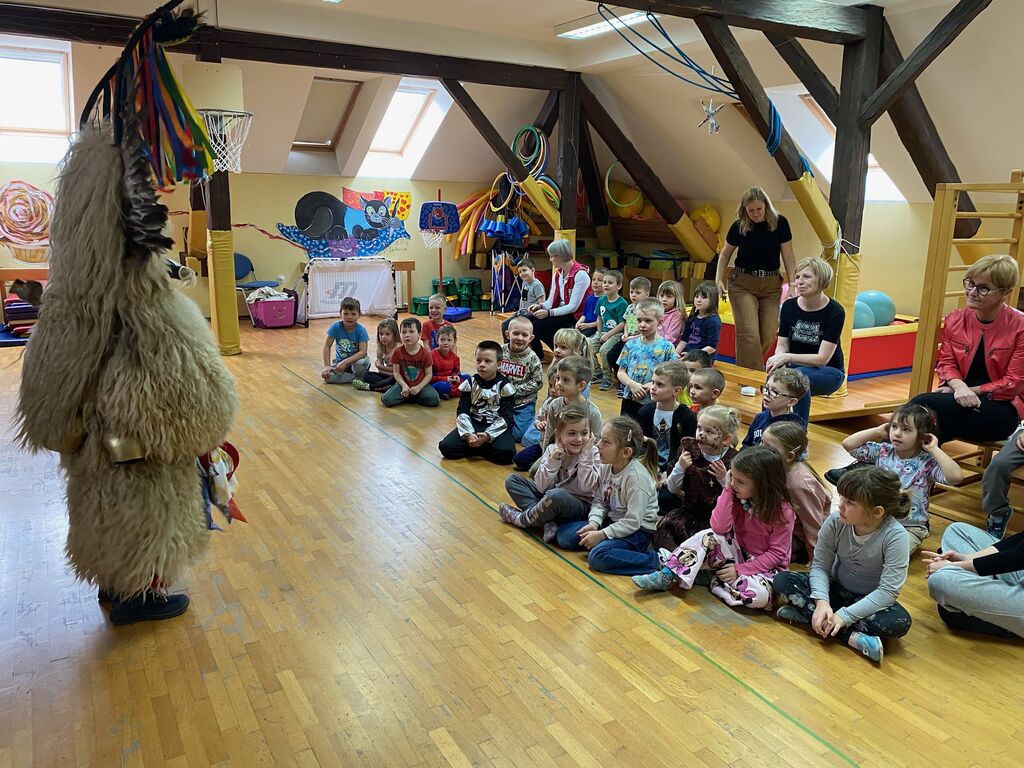 Z otroki smo spoznavali tradicionalne etnografske like. Izdelovali smo pokrivala, kakršna imajo škoromati, poskusili zvoniti z zvonci okoli pasu, coprnica Uršula nam je skuhala coprniški napitek. Igrali smo se klovnovske igre in ustvarjali klovnove klobučke in kurente.