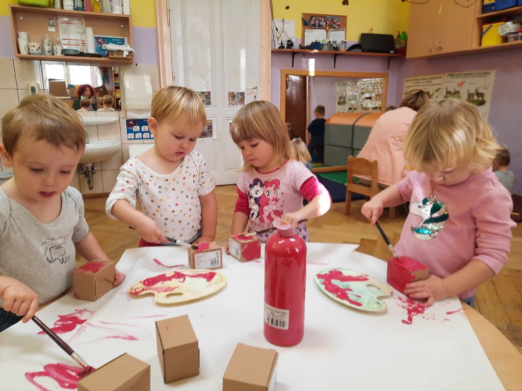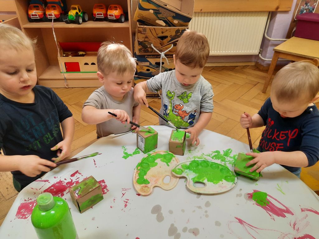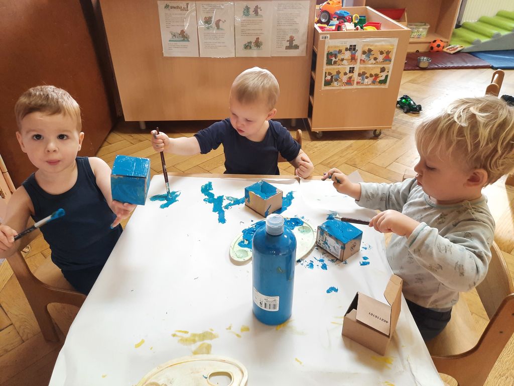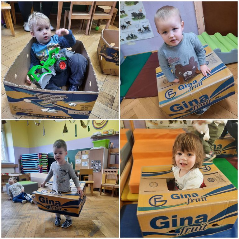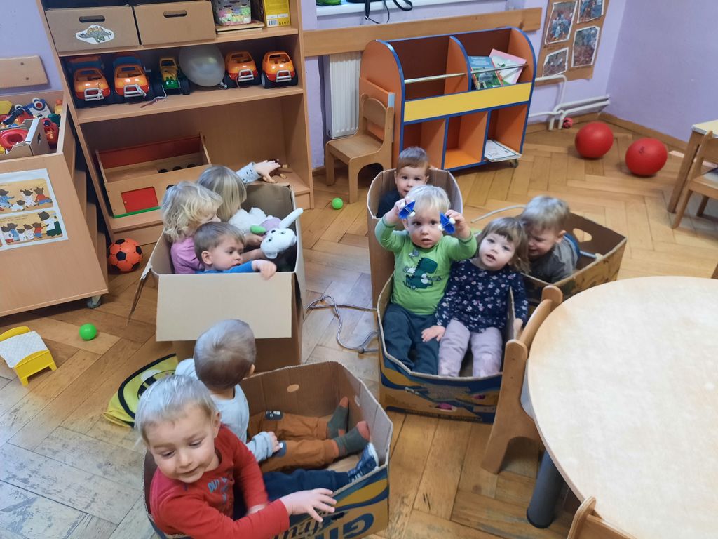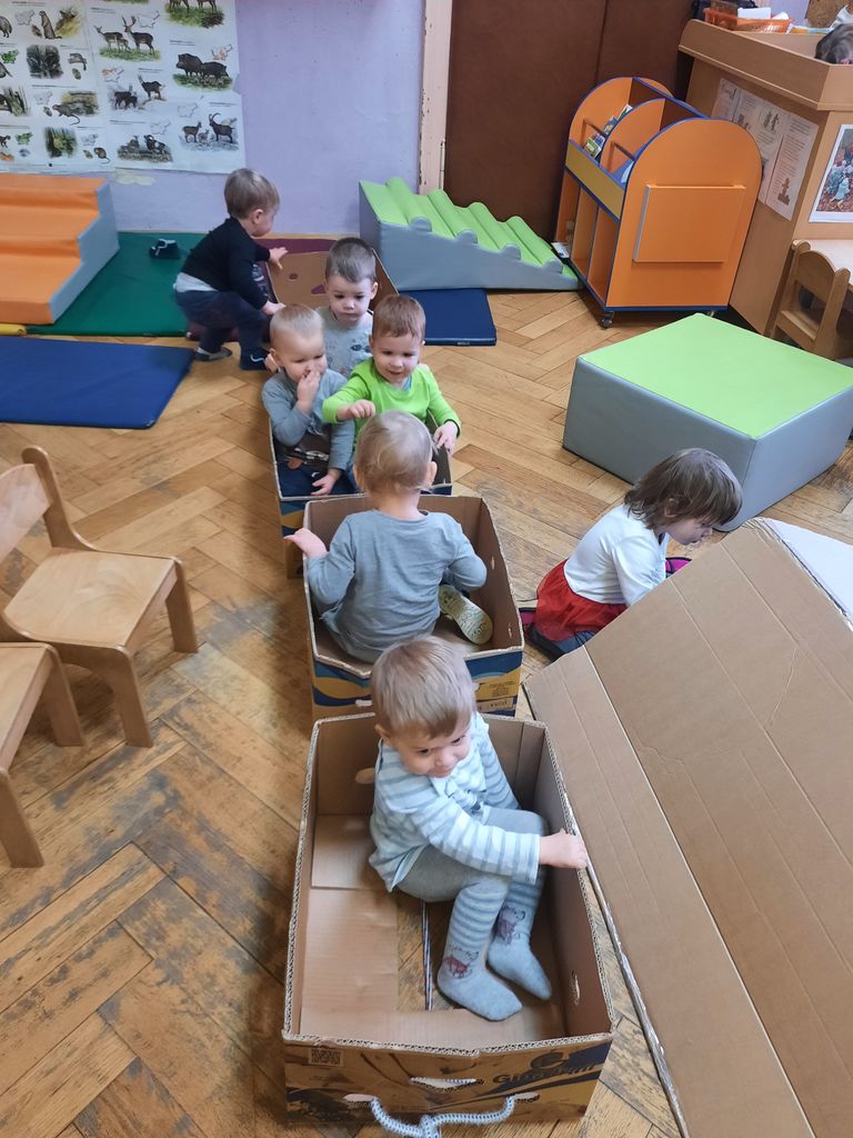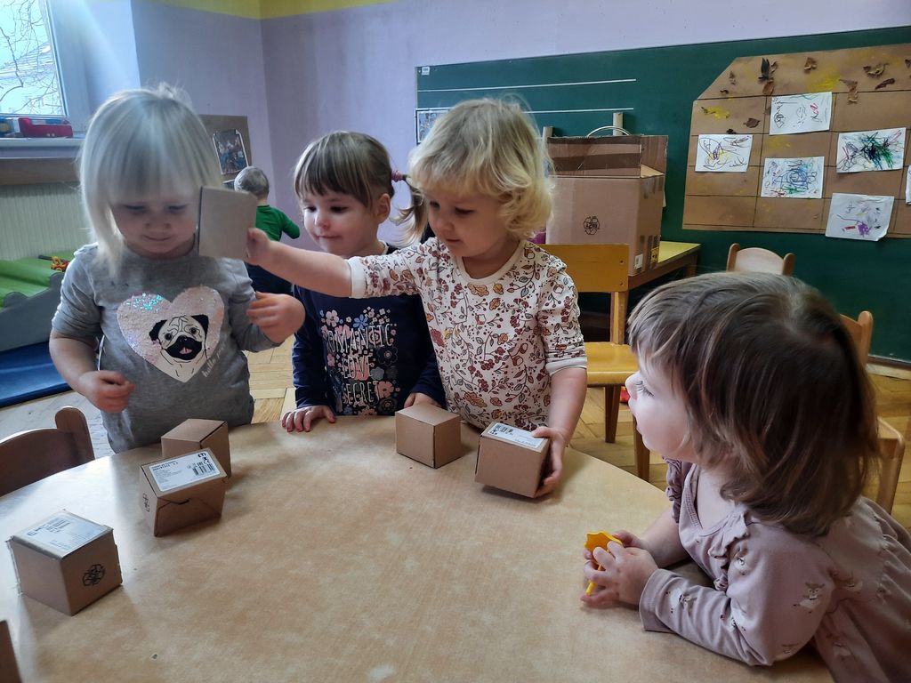Škatla je nekomu lahko le nepotrebna smet ali navlaka, otrokom pa je včasih veliko bolj zanimiva kot kup pisanih igrač. Zato smo se januarja v naši skupini posvetili igri s škatlami. Čeprav smo se ves mesec igrali »samo« z njimi, smo z dejavnostmi pokrili vsa področja kurikuluma. S škatlami smo si naredili gibalni poligon, kjer smo si poleg koordinacije rok in nog krepili ravnotežje, z metanjem žog v veliko škatlo, ki je postala koš, pa preciznost. Naredili smo tudi avto na vleko, tako smo si krepili moč. Da je matematika v vrtcu prijetna izkušnja, smo manjše škatle postavljali v stolp in šteli. Z zlaganjem manjših škatel v večje smo preverjali volumen. Velikost škatle smo preverjali tudi s tem, koliko otrok sprejme noter. Škatle so z našo pomočjo postale različnih barv, ki smo jih poimenovali in razvrščali. S škatlami smo potovali v živalski vrt in se  pogovarjali, katere živali so tam. Ob koncu dneva so postale tudi prijeten prostor za počitek, prepevanje pesmic in poslušanje pravljice.