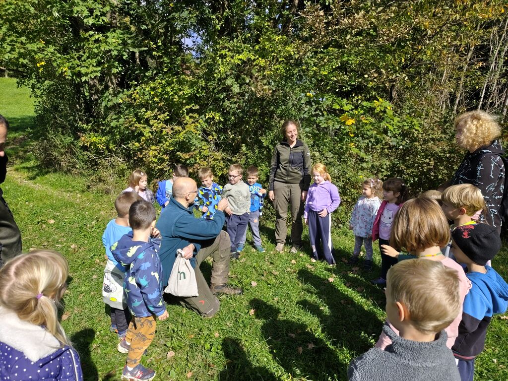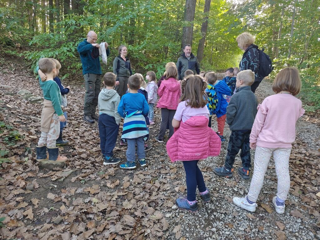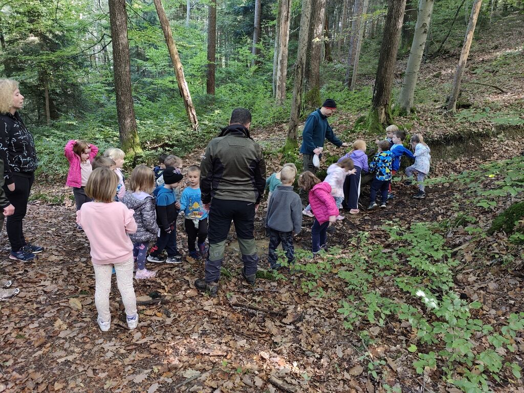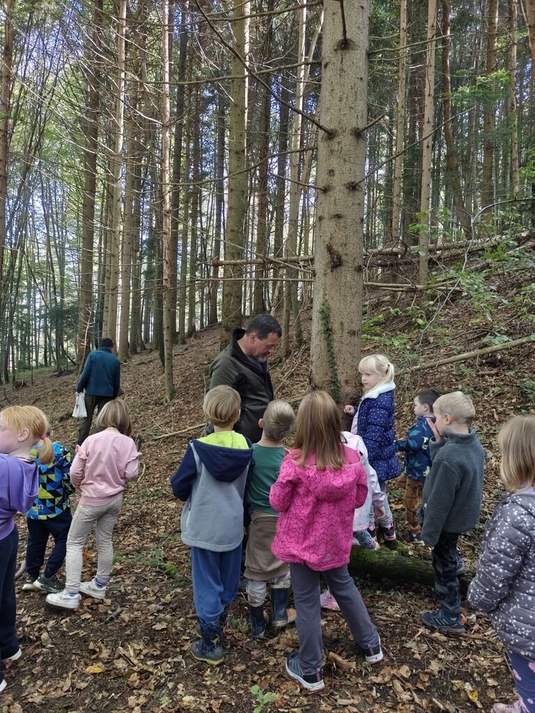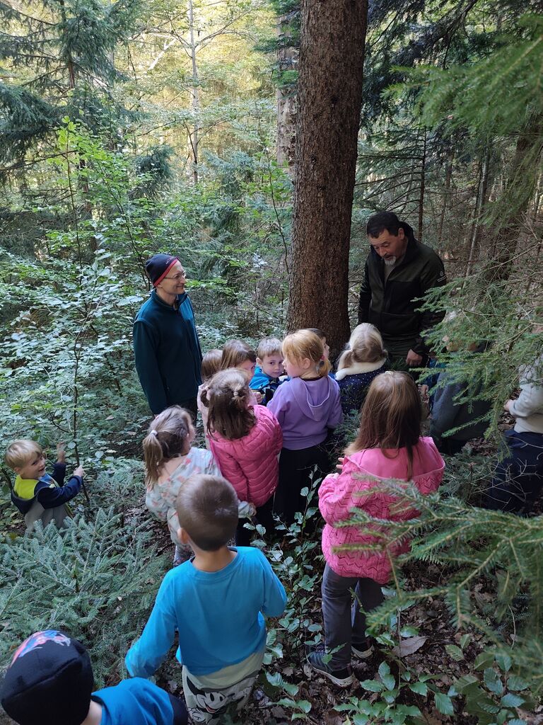 Na lep jesenski dan nas je pot iz vrtca vodila proti gozdu, kjer so nas čakali trije odrasli, oblečeni v zeleno. Preden so se predstavili ekipi dvajsetih »škratkov«, so otroci ugotavljali, kaj so po poklicu. Prva ideja je bila, da so lovci, že v drugo pa smo našli pravi odgovor, da so to gozdarji Špela, Janez in Jože, ki so naši »pomočniki« za odkrivanje neznanega v gozdu. Na tokratnem srečanju smo večino časa posvetili divjim prašičem. V prvem delu gozda smo iskali gozdne plodove – želode in bukove žire, ki jih imajo te živali zelo rade. Ugotovili smo, da jih ni veliko ali pa so že vse pojedli. Pot nas je vodila v gozd proti hribu Rigl, kjer smo si ogledali gozdno kopalnico, kjer se divji prašiči kopajo in drgnejo ob drevesa, da si odstranijo bolhe. Na drevesu se zaradi smole prilepijo ščetine. Nekaj smo jih našli. V gozdni kopalnici je tudi velika luža, ki ne vabi samo divje prašiče, ampak je zelo pritegnila tudi nekatere škrate. Sledi divjih prašičev v blatu nismo našli, smo si pa lahko ogledali kar nekaj sledi srn.