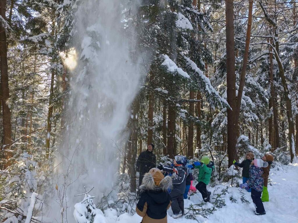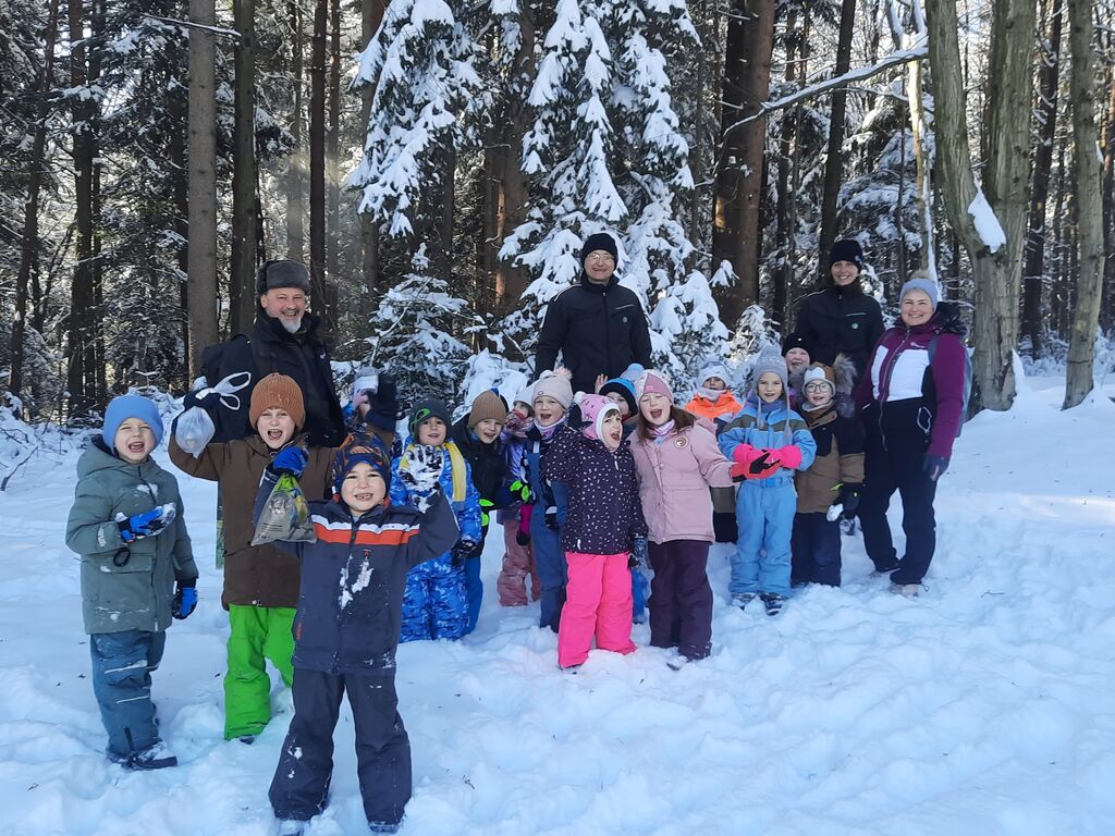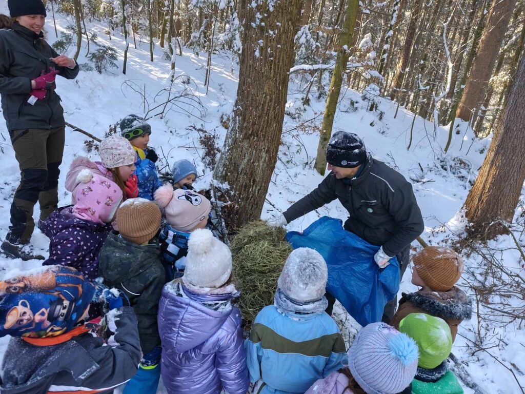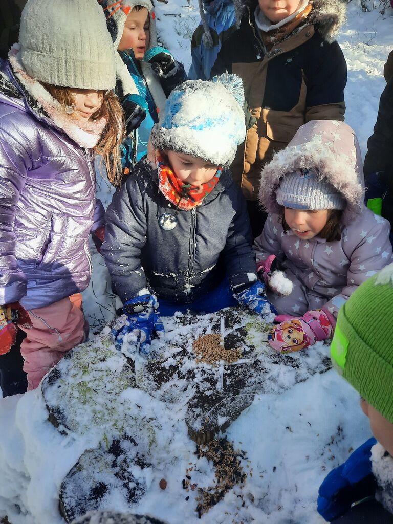 Ko smo prispeli na obronke gozda na Marelici, nam je gozdar Janez pomagal pobrskati po spominu, katere živali prebivajo v našem slovenskem gozdu. Domišljija nekaterih škratov je bila zelo velika, zato smo ugotavljali ali v našem gozdu živijo tiger, opica ali srna, lisica, medved. Da je naša ugotovitev prava, smo preverili v knjigi, kjer so sledi gozdnih živali, ki smo jih naši v snegu. Pot smo nadaljevali v gozd bogat z jelkami in smrekami. Ko smo videli, koliko snega držijo jelke na vejah, smo najprej očistili majhne, kar ni bilo težko. Pri velikih sta nam pomagala gozdarja, kar pa je povzročilo veliko smeha in zabave, saj je sneg z dreves počasi padal na naše glave, kapuce, ramena in še kam. S sabo smo prinesli topel čaj, da nas ni zeblo. Potem smo skupaj z gozdarjem Jožetom naredili krmišče za srne ter vanj položili seno. Odločili smo se, da naslednjič pridemo pogledat ali so srne našle hrano. Ker nismo imeli ptičje hišice, smo hrano za ptice položili na štor, ki smo ga prej dobro očistili. Nazaj v vrtec smo se vrnili po poti mimo kampa Vransko in se čudili, kako lep razgled je tam. Za zaključek pa smo se pozabavali s kopanjem zakladov v snegu. Hvala gozdarjem za pomoč pri pridobivanju čudovitih življenjskih izkušenj v zasneženem gozdu!