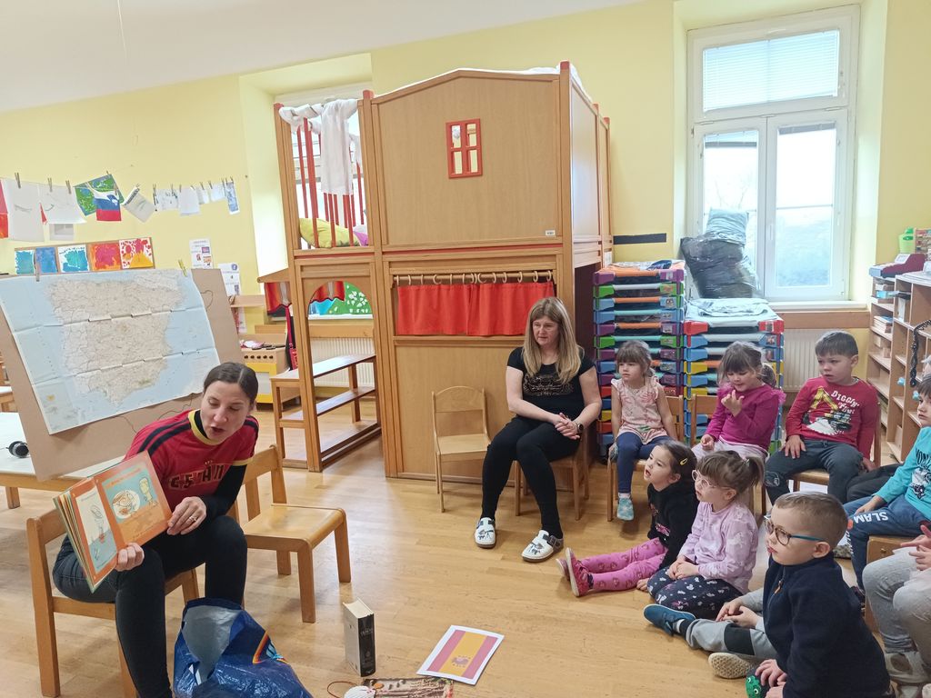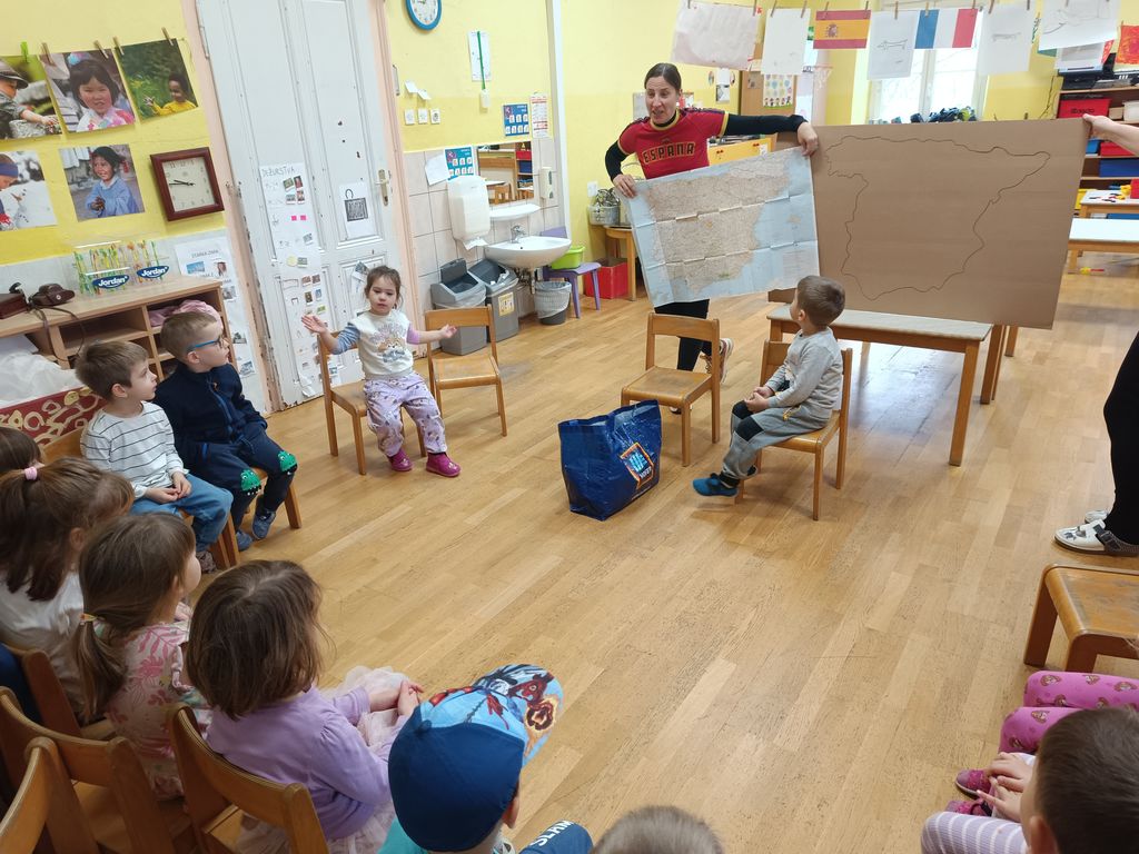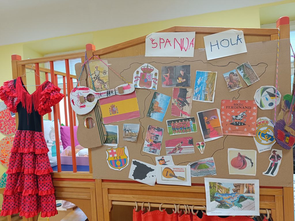 Želeli smo spoznati Španijo – deželo flamenka, bikoborb in nogometa. V našem oddelku nas je obiskala ga. Jerca Novak, profesorica španščine, ki nam je pobliže predstavila državo Španijo in španski jezik. Prebrala nam je pravljico Poredni Petitt v španskem jeziku in se z nami »po špansko« pogovarjala. Naučila nas je tudi pozdrava: »Hola!« Predstavila nam je nekaj vljudnostnih fraz, števil do deset ter nekatere značilnosti Španije, za kar se ji lepo zahvaljujemo.
