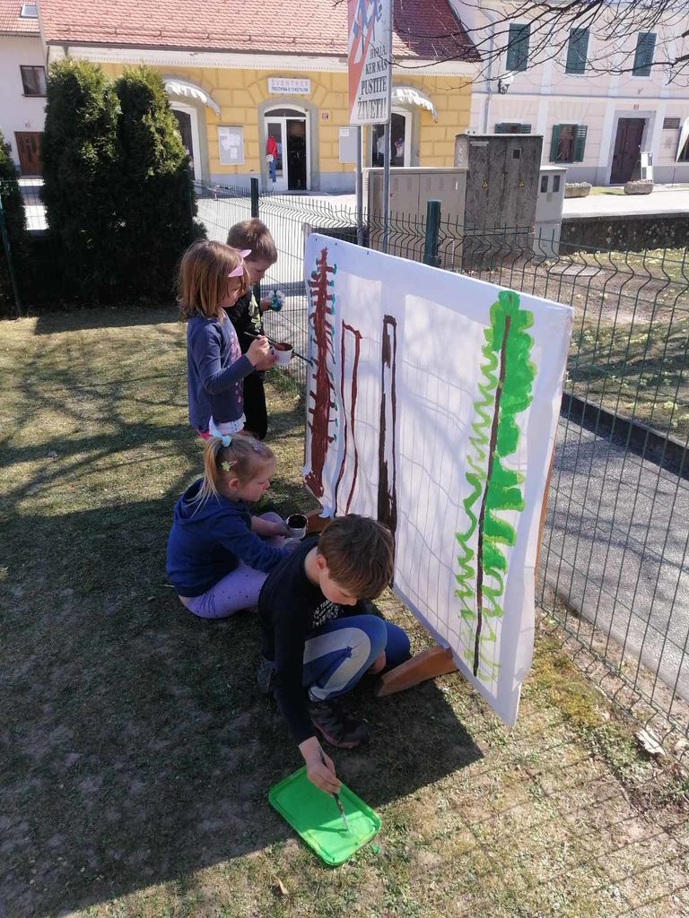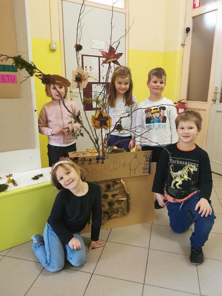 Kaj vse smo počeli? Odpravili smo se v gozd na Gorici, kjer smo raziskovali, se igrali in nabirali naravni material. Iz nabranega materiala smo izdelali dekoracijo vrtca ter »revno bajtico« za predstavo Peter Klepec. V pravljičnem decembru smo izdelovali okraske in smrečice in z njimi okrasili vrtec. V snežnem vremenu smo si privoščili ustvarjalno dričanje z žaklji na Gorici. Zaznamovali smo slovenski kulturni praznik z izdelovanjem zastave, grba in portretov Franceta Prešerna z različnimi likovnimi tehnikami. Na igrišču vrtca smo na velikih formatih s tempera barvami ustvarili sceno za predstavo Enci benci, prav tako pa smo na igrišču kiparili iz mivke ter izdelovali izdelke iz lesa. To pomeni da smo na veliko »žebljali«, žagali in zabijali.