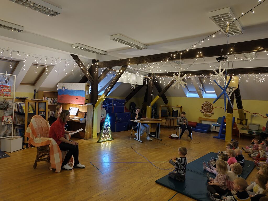 Zadnji ponedeljek pred prazniki smo bili povabljeni v šolsko knjižnico, kjer so nam petošolke skupaj s knjižničarko Katjo zaigrale predstavo Skuhaj mi pravljico (avtorice Majde Koren). Otroci so z zanimanjem spremljali »kuhanje« pravljice. Zadnji dan pred prazniki pa smo se zopet zbrali v večnamenskem prostoru, kjer smo imeli predbožično zabavo s prazničnimi motivi in glasbo, ob kateri smo plesali, se družili in se veselili. Praznovanje smo zaključili z animirano risanko in sveže pečenimi kokicami. Dočakali smo pa tudi čarobni trenutek, ki smo ga vsi dolgo čakali, začelo je snežiti.