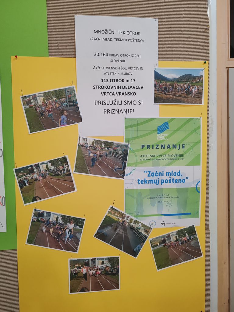 Kot vsako leto je bil tudi letos v Vrtcu Vransko september športno obarvan. Najprej smo se ob dnevu slovenskega športa udeležili Teka za smeh, ki že 13. leto zapored spodbuja h gibanju. Letos se je vrtec pridružil teku družin, kjer so otroci in starši ter strokovni delavci vrtca pretekli razdaljo 300 metrov. Ob koncu smo si prislužili medaljo, jabolko in plastenko vode. Na pobudo Atletske zveze Slovenije smo se udeležili množičnega teka »Začni mlad, tekmuj pošteno«. Namen akcije je spodbuditi otroke k prvim atletskim korakom ter ozavestiti sodelujoče o pomenu zdravega načina življenja. Dan je potekal v sproščenem in športno obarvanem vzdušju. Po pretečeni razdalji je vsaka skupina prejela zasluženo diplomo za sodelovanje. Sodelovalo je 113 otrok v starosti od 1 do 5 let ter 17 strokovnih delavcev vrtca. Naj nas naslednje leto sodeluje še več.