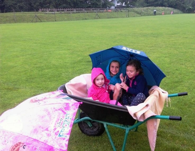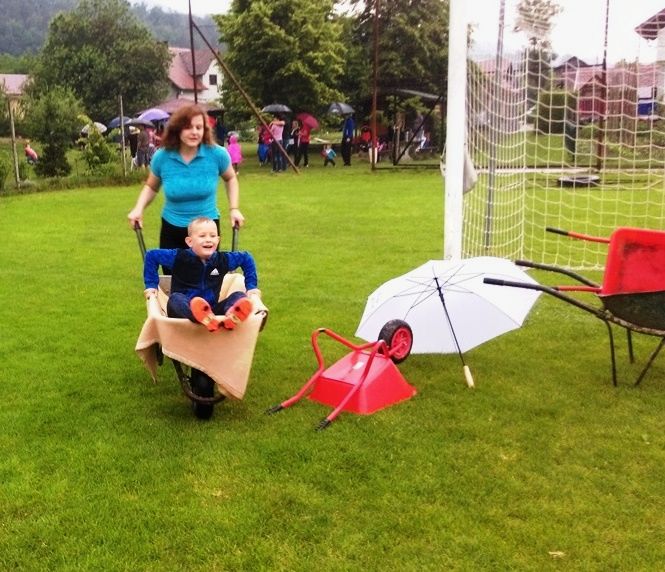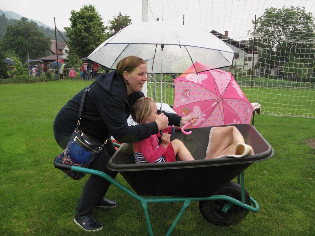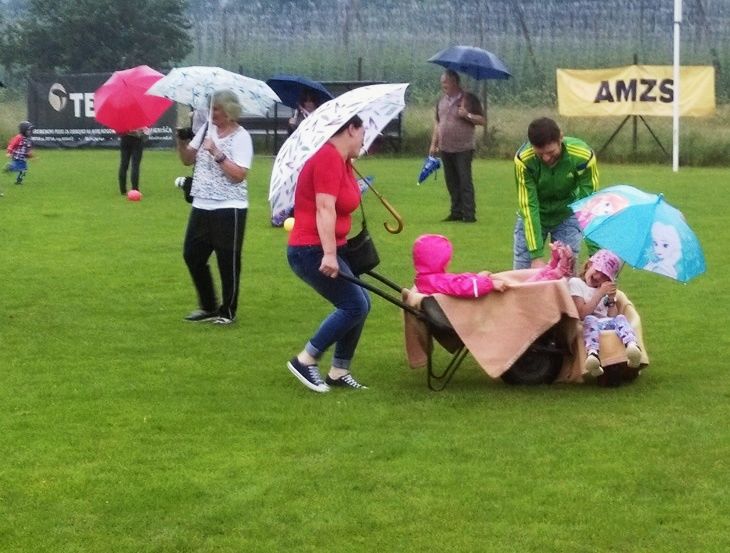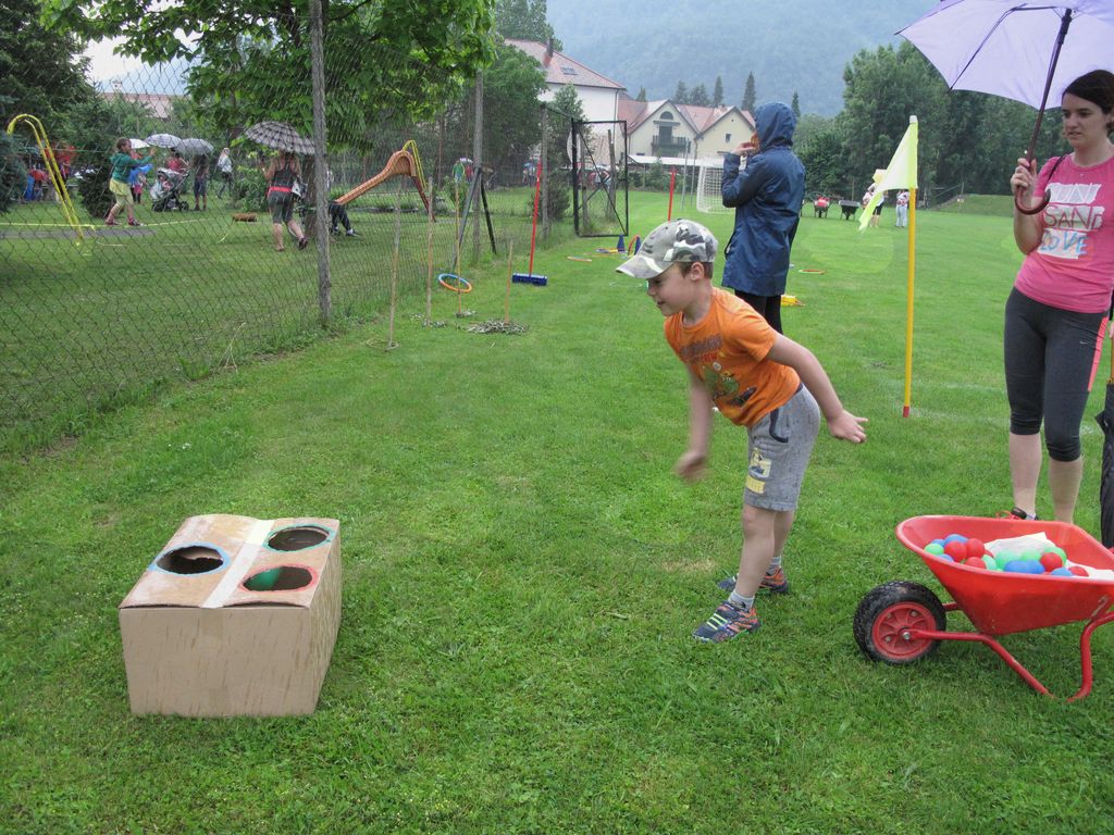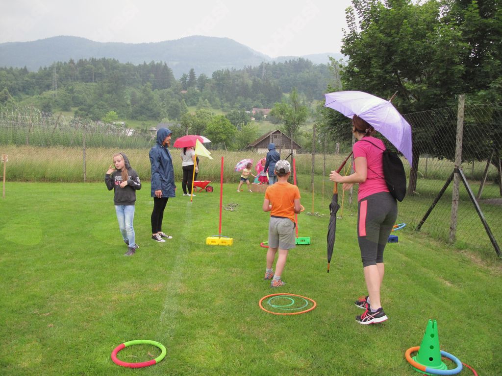 Tako so se otroci v pelerinah in pod dežniki udeležili krosa, poskokov v žaklju, metanja obročev na palice,  gibalnega poligona z naravnimi materiali, hoje po vrvi, vlečenja vrvi, igranja nogometa, igre s padalom, vožnje v samokolnici, spuščanja po toboganu ...  Gibalne dejavnosti so potekale na igrišču vrtca in nogometnem igrišču.  Zahvaljujemo se tudi našim nogometašem, ki so nam to popoldne prepustili igrišče in prilagodili urnik treninga.