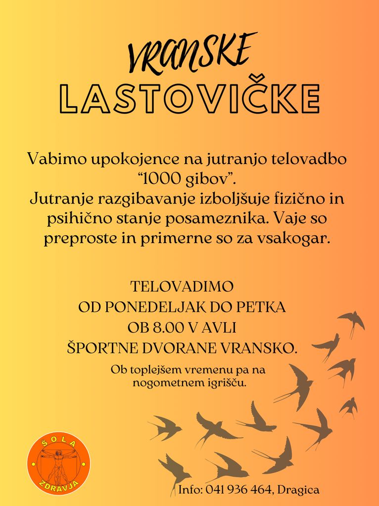 Telovadimo od ponedeljka do petka ob 8.00 v avli Športne dvorane Vransko, ob toplejšem in suhem vremenu pa na nogometnem igrušču.