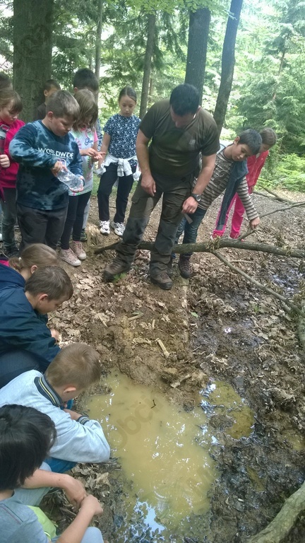 Na koncu nas je čakalo pravo presenečenje. Odpravili smo se proti gozdni kopalnici, ki jo uporabljajo divji prašiči. Poiskali smo drevo, ki divjim prašičem služi kot brisača in na njem nam je gospod Janez poiskal ščetino divjega prašiča.