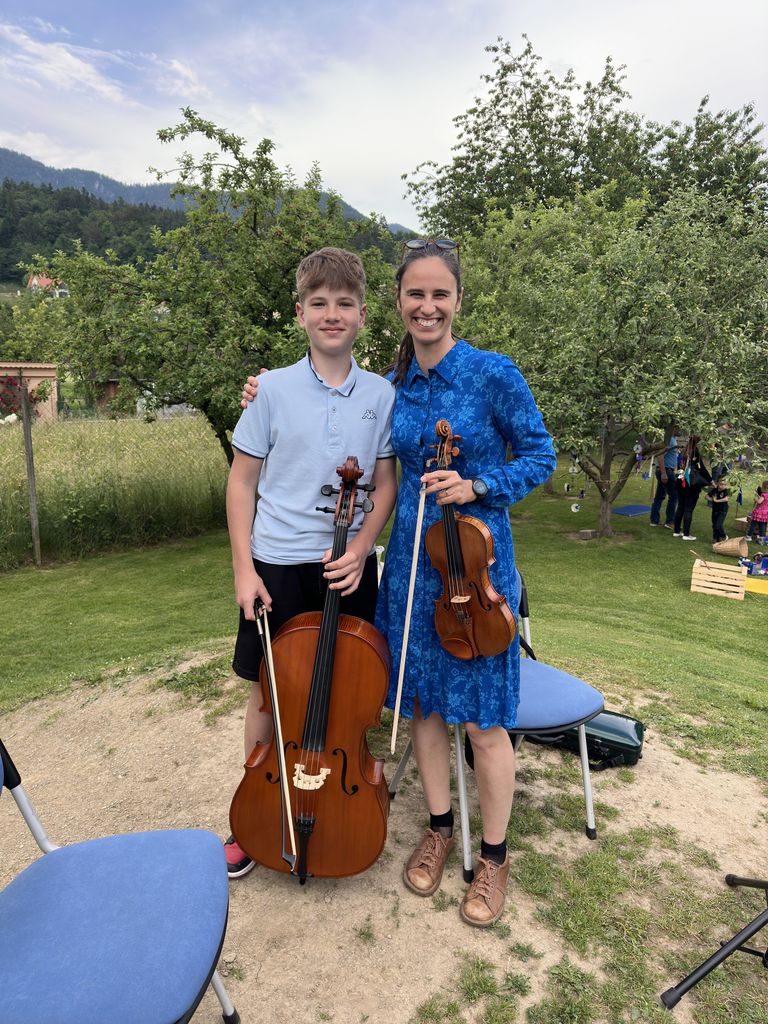 Z letošnjim zaključnim srečanjem smo zaokrožili sklop dejavnosti v projektu Teden umetnosti v vrtcu s pomenljivim naslovom ''Jaz, ti, mi'' ter medse povabili dva lokalna umetnika: učenca Osnovne šole Vransko-Tabor, violončelista Aljaža Kuserbanja ter violinistko v Simfoničnem orkestru RTV Evo Rajh. Med srečanjem sta nas navdihovala s klasičnimi skladbami, ki so dopolnjevale umetniško ustvarjanje otrok in staršev.