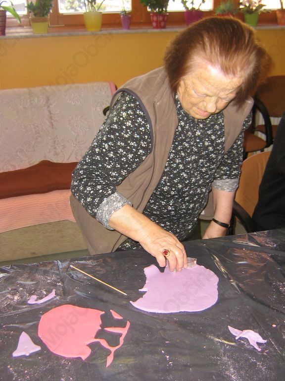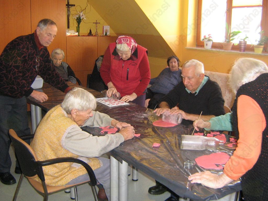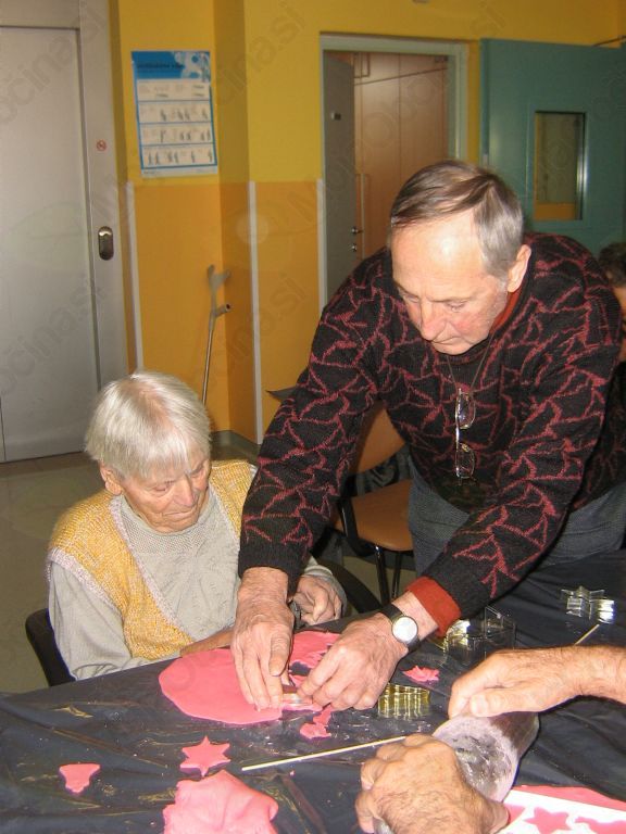 Počasi bo treba pripraviti vse potrebno za postavitev božičnega drevesca in jaslic. S stanovalci smo se te naloge lotili zelo resno. Nekaj maha smo že nabrali. Upamo, da bo sneg kmalu skopnel in ga bomo še lahko nabrali. Božično žito smo posejali na god sv. Lucije. Dan prej, 12. decembra, pa smo pripravljali okraske za naše božično drevesce. Izdelovali smo jih iz slanega testa. Naša delovna terapevtka je z nasveti kuharic zamesila testo. Polovico ga je obarvala z nežno rdečo barvo, drugo polovico z lepo bledo vijoličnim odtenkom. Tudi medicinske sestre in bolničarke, ki so vmes prišle preverit, kako nam gre, so povedale, da je izbor barv zelo lep. Najprej smo testo na tanko razvaljali, nato pa kar z modelčki za peko piškotov oblikovali okraske. Seveda smo izbrali tiste bolj praznične - zvezdice, lunice, škorenjčke, smrekice in podobno. Na vrhu smo s špilo naredili luknjo, da bomo skozi zavezali nit. Vse okraske smo zložili na kartone in dali na toplo, da se bodo posušili. Za popestritev drevesca smo na tanko razrezali še grenivko, pomarančno in limono ter te rezine dali sušit na radiatorje. Tako bodo naša božična drevesca, ki jih boste lahko videli v Našem domu, okrašena s povsem naravnimi materiali.