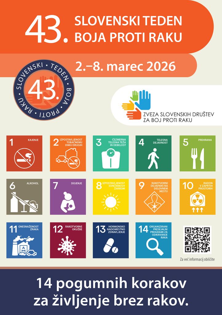 v Sloveniji od 2. do 8. marca poteka 43. tradicionalni slovenski teden boja proti raku, letos pod geslom »14 pogumnih korakov za življenje brez rakov«. Aktivnosti tedna tradicionalno organizira Zveza slovenskih društev za boj proti raku v sodelovanju z Onkološkim inštitutom Ljubljana (OI Ljubljana), Ministrstvom za zdravje (MZ) in Državnim programom za obvladovanje raka (DPOR). Pridružujemo se jim tudi v regijskih društvih za boj proti raku.