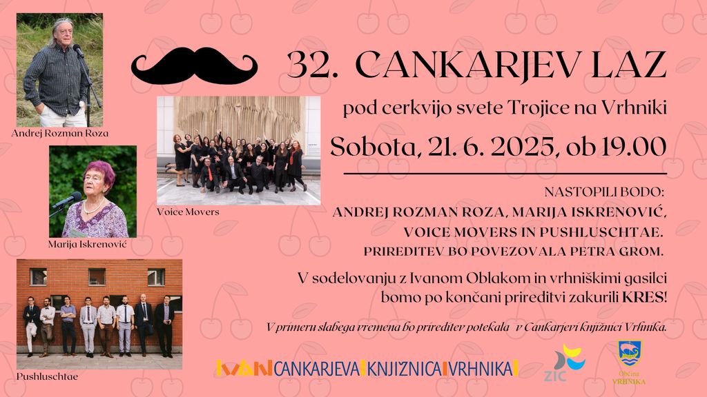 Prijazno vabljeni na 32. Cankarjev laz pod cerkvijo svete Trojice na Vrhniki (v primeru slabega vremena/dežja bo prireditev v Cankarjevi knjižnici Vrhnika). V soboto, 21. 6. 2025, ob 19.00. Nastopili bodo Andrej Rozman Roza, Marija Iskrenović, Voice Movers in Pushluschtae. Prireditev bo povezovala Petra Grom.