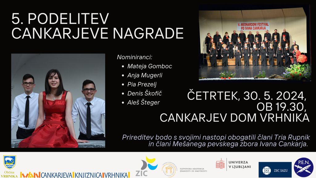 Slovenski center PEN, Slovenska akademija znanosti in umetnosti, Univerza v Ljubljani, Znanstvenoraziskovalni center SAZU, Zavod Ivana Cankarja Vrhnika in Cankarjeva knjižnica Vrhnika vas prijazno vabimo na peto podelitev Cankarjeve nagrade za najboljše izvirno literarno delo minulega leta v zvrsteh v katerih je ustvarjal naš največji pisatelj Ivan Cankar. Prireditev bodo s svojimi nastopi obogatili člani Tria Rupnik in člani Mešanega pevskega zbora Ivana Cankarja. Velika dvorana Cankarjevega doma Vrhnika, v četrtek, 30. 5. 2024, ob 19.30. Cankarjevi dnevi 2024.