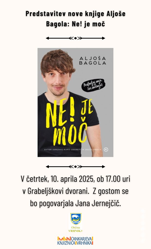 Vabljeni na predstavitev nove knjige Aljoše Bagola: Ne! je moč. V četrtek, 10. 4. 2025, ob 17.00 v Grabeljškovi dvorani. Z avtorjem se bo pogovarjala Jana Jernejčič. Kot so zapisali na emka.si: »Aljoša Bagola je kreativni velemojster in pionir priročniških uspešnic pri nas. Kot slovenski kreativni direktor desetletja se je po hudi izgorelosti umaknil iz oglaševalskih vod in svojo ljubezen do kreativnosti usmeril v pisanje knjig. Njegov prvenec Kako izgoreti in vzeti življenje v svoje roke je navdušil bralce ter postal najbolje prodajana knjiga leta 2020 pri nas. Njegova druga knjiga Srečo, prosim se je dve leti zatem zavihtela na drugo mesto najbolj prodajanih knjig. Obe knjigi se ponašata že s skoraj desetimi ponatisi.« Prijazno vabljeni.