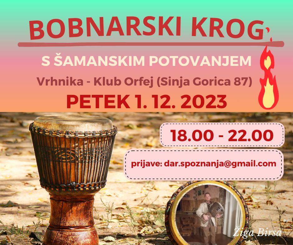 V PETEK 1. 12. 2023 se nam od 18:00 do 22:00 v Klub Orfej na Vrhniki pridružite v Bobnarskem krogu s šamanskim potovanjem (v zaključnem delu srečanja).