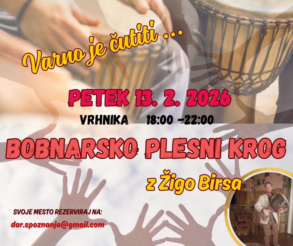 V PETEK 13. 2. 2026 se na Vrhniki v Klubu Orfej srečamo v izraznem in podpornem Bobnarsko plesnem krogu pod mentorstvom Žiga Birse.