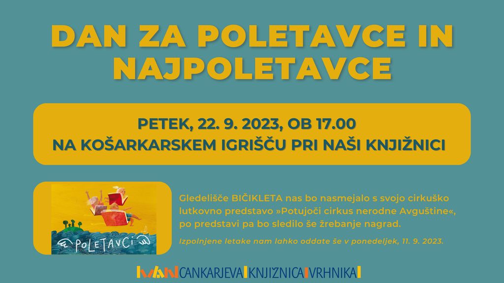 Dan za Poletavce in NajPoletavce bo v petek, 22. 9. 2023, ob 17.00 na košarkarskem igrišču pri naši knjižnici. Vsi sodelujoči boste prejeli priznanje in majico Poletavci/NajPoletavci ter sodelovali v žrebanju za nagrade. V izogib gneči vas vabimo, da pridete že nekoliko prej; majice boste lahko prevzeli že od 16.15 naprej. V primeru slabega vremena bo prireditev v prostorih nekdanjega muzeja Moja Ljubljanica v pritličju Kulturnega centra Vrhnika.