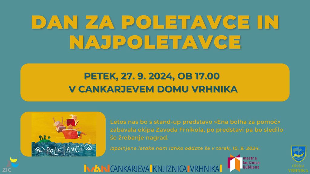 Dan za Poletavce in Najpoletavce bo v petek, 27. septembra 2024, ob 17.00 v Cankarjevem domu Vrhnika. Vsi sodelujoči boste prejeli priznanje in majico Poletavci/Najpoletavci ter sodelovali v žrebanju za nagrade. V izogib gneči vas vabimo, da pridete že nekoliko prej; majice in priznanja boste lahko v avli CDV prevzeli že od 16.15 dalje. Letos nas bo s stand-up predstavo »Ena bolha za pomoč« zabavala ekipa Zavoda Frnikola, po predstavi pa bo sledilo še žrebanje nagrad. Če še niste oddali izpolnjenih letakov, kamor ste beležili svoje poletne bralne podvige, jih lahko do vključno torka, 10. septembra oddate na mladinskem oddelku naše knjižnice. Vabljeni. V sodelovanju z Mestno knjižnico Ljubljana, Zavodom Ivana Cankarja Vrhnika in donatorji nagrad.
