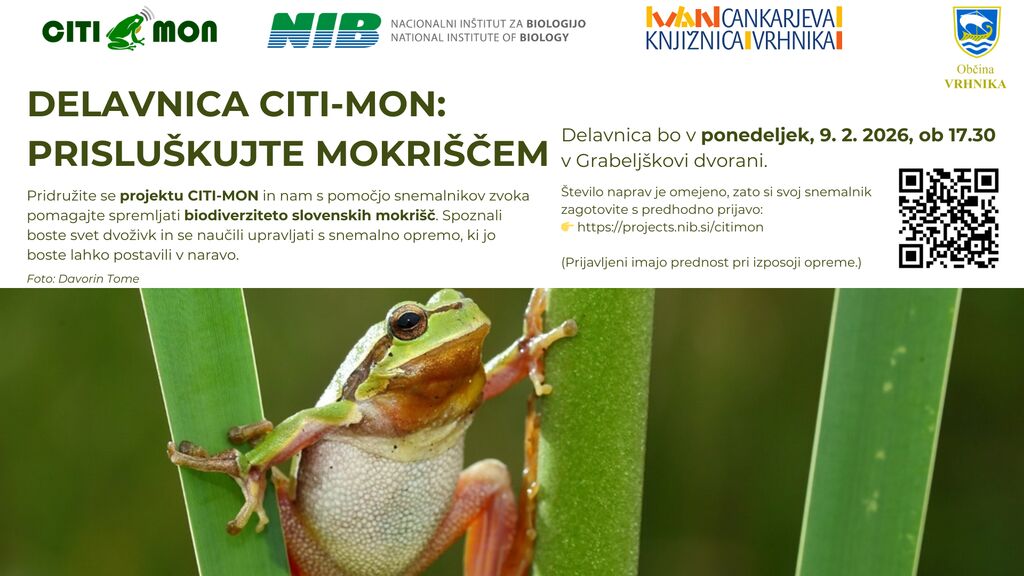 Nacionalni inštitut za biologijo (NIB) prireja projekt občanske znanosti CITI-MON: Uporaba občanske znanosti in zvočne krajine za spremljanje biodiverzitete mokrišč. V projektu bomo uporabili tehniko snemanja zvočne krajine za zaznavanje in spremljanje oglašanja dvoživk v mokriščih po vsej Sloveniji s pomočjo občanskih raziskovalcev. S tem bomo prispevali k poznavanju teh ranljivih živali, pa tudi stanja njihovega življenjskega okolja, udeleženci pa boste lahko izvedeli več o raznolikosti dvoživk v svoji okolici.