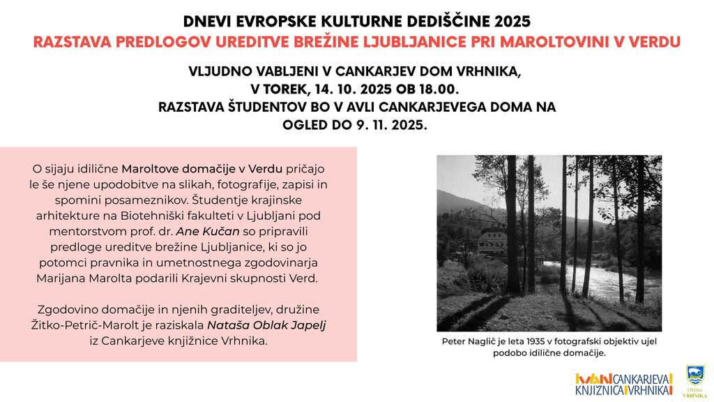 Dnevi evropske kulturne dediščine 2025 - Razstava predlogov ureditve brežine Ljubljanice pri Maroltovini v Verdu